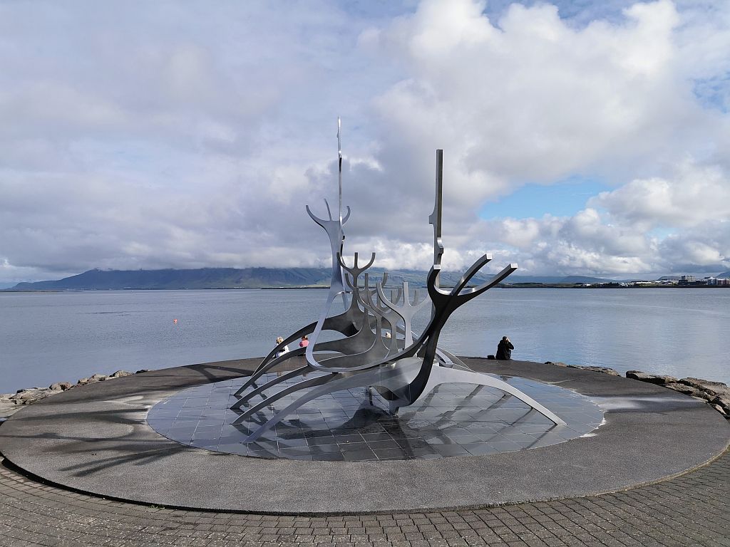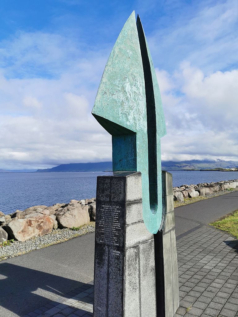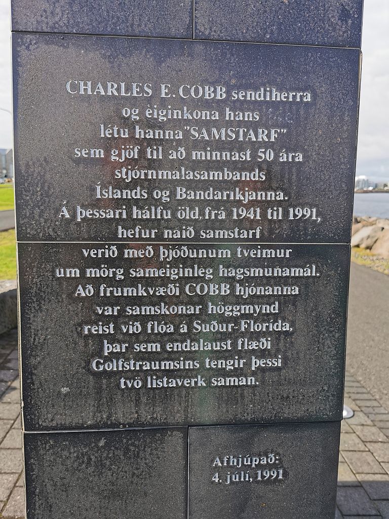 Diese Skulptur symbolisiert die Freundschaft zwischen Island und den USA seit 1941. Eine gleiche Skulptur steht in Süd-Florida, von wo aus der Golf-Strom diese beiden Skulpturen verbindet.
