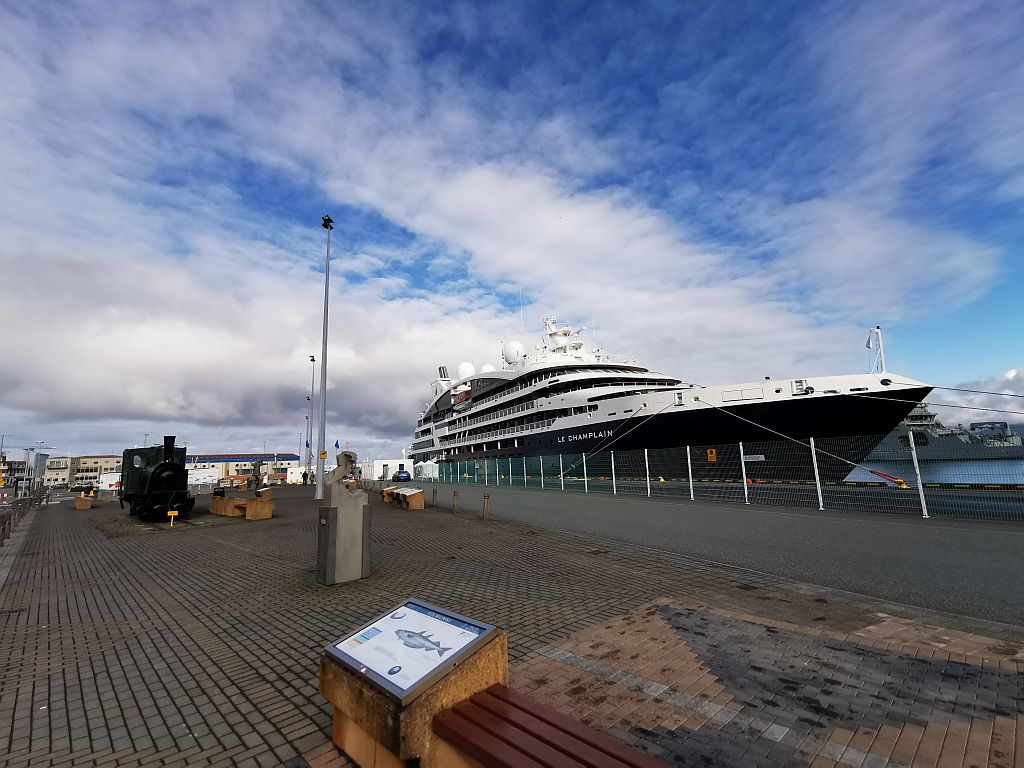 Neben dem Anleger mit der alten Hafenlokomotive steht ein relativ neues Gebäude: Das Harpa!