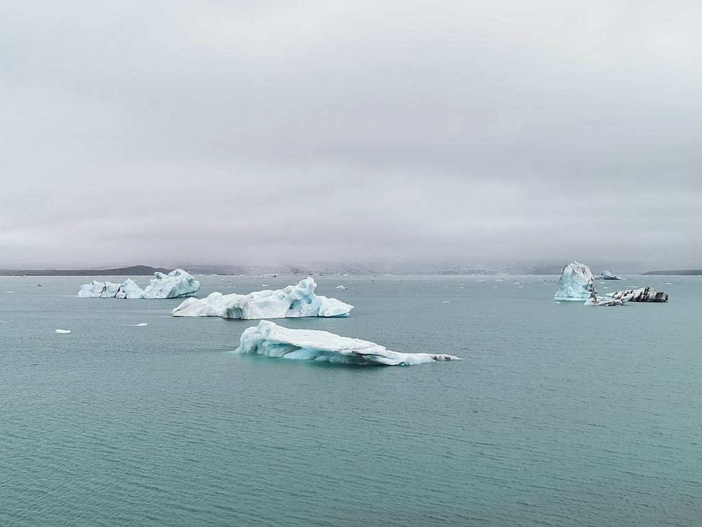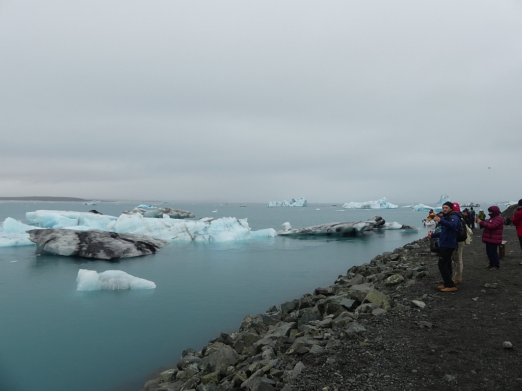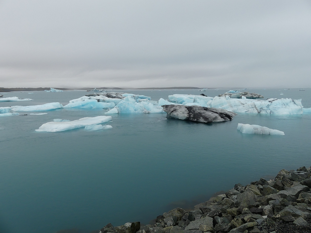 Die blauen Eisberge sind übrigens diejenigen, die sich umgedreht haben, denn an der Unterseite sind die Eisberge geschmolzen und haben keine Luftpartikel im Eis. Die noch nicht „gewendeten“ Eisberge sehen hier aufgrund des hohen Aschegehaltes in der Luft und im Sand, eher schwarz aus.