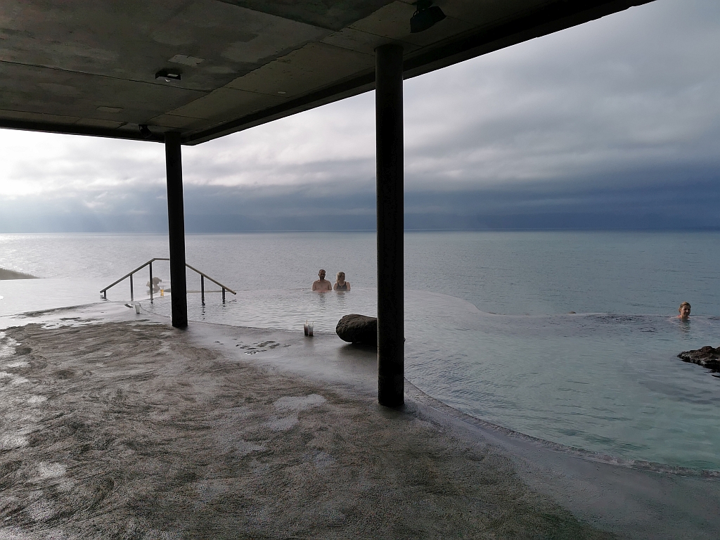 Ebenfalls relativ neu und sehr modern an der Steilküste gelegen, war das jetzt genau das, was wir brauchten. Also, wie üblich, Schuhe am Eingang ausziehen, nackig unter die Dusche, Badehose an und ab …