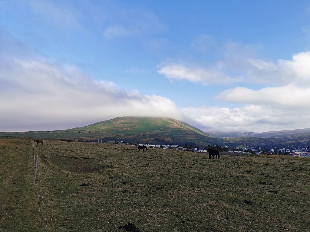 Irgendwann „drohte“ aber dann die Fahrt zurück nach Akureyri. Wobei uns Husavik noch mit einem halb-blauen Himmel und einem sehr isländischen Bild mit Pferden und einem Berg verwöhnte.