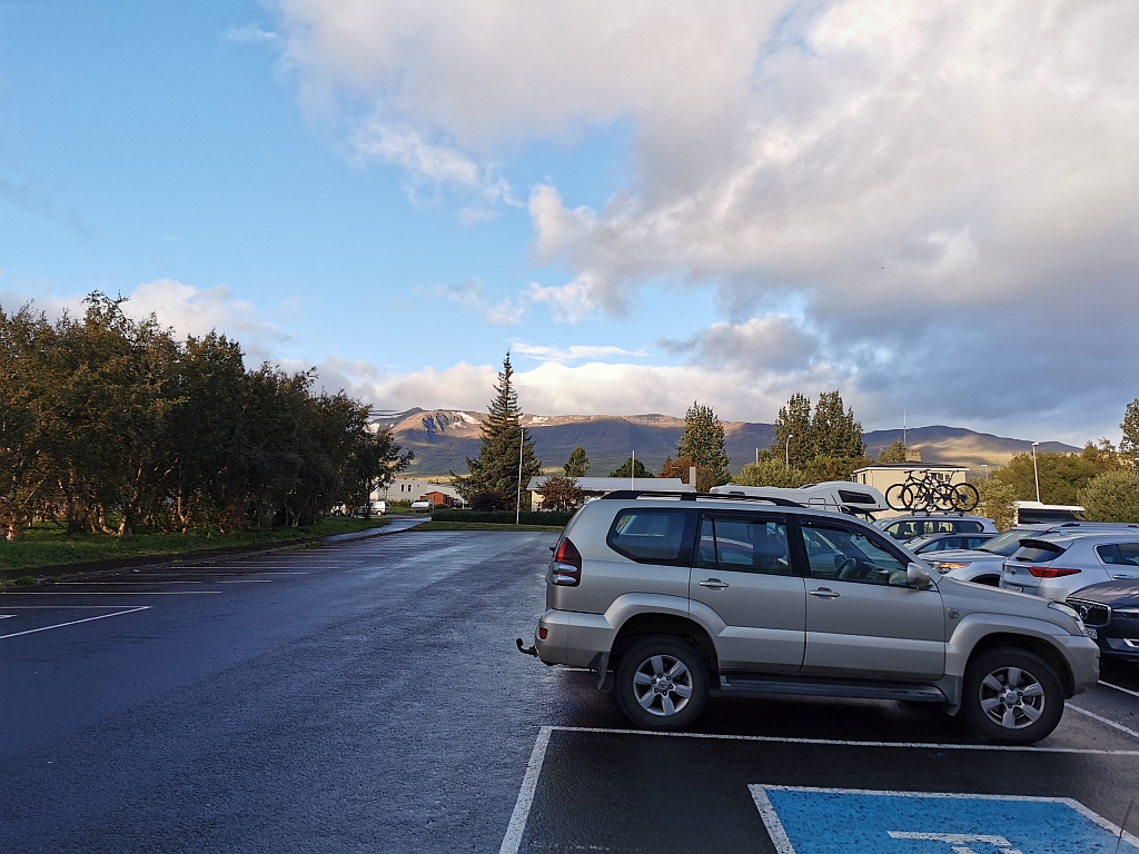 Nach dem etwas dürftigen und tatsächlich etwas stressigen Frühstück ging es zu unserem wartenden Auto auf den Parkplatz. Dabei bemerkten wir tatsächlich: Berge! Und auch noch schön aussehende! Gleich hinter unserem Parkplatz!