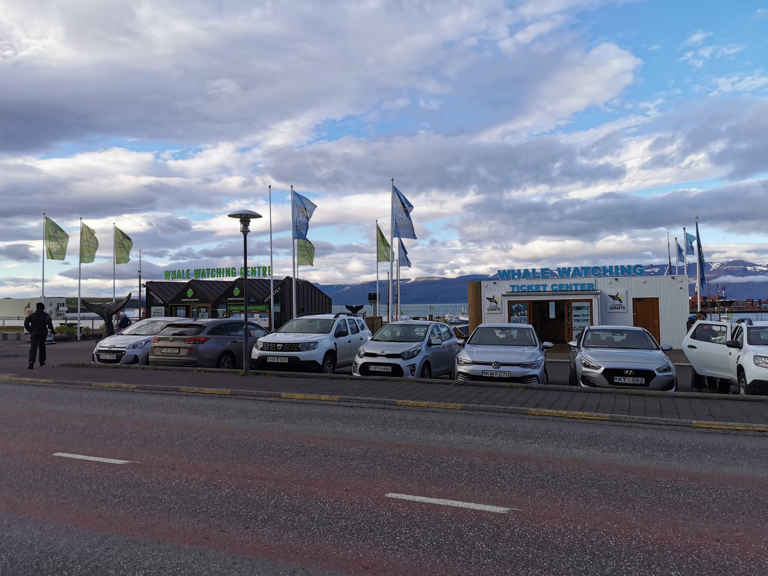 Da wir uns wieder einmal auf dem Weg etwas Zeit gelassen haben, kamen wir so etwa 10 vor 10 in Husavik an. Und haben erst einmal einen halb-legalen Parkplatz gesucht, um halb-pünktlich zu unserer (hoffentlich nicht halben) Wal-Beobachtungstour aufbrechen wollten. Treffpunkt war der quasi Mittelpunkt der kleinen Stadt: Das „Whale Watching Center“
