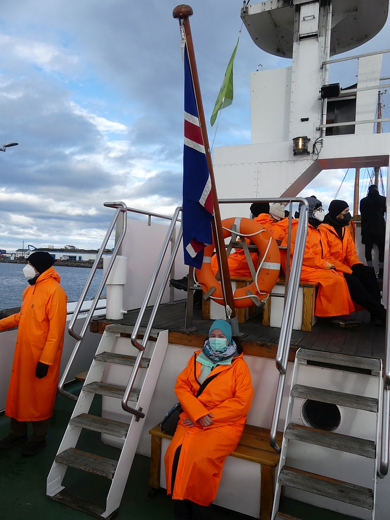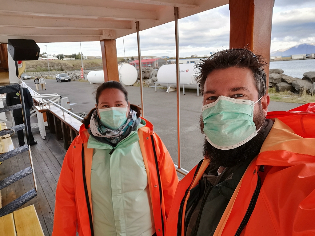 Hier checkt man quasi für alle Touren, die hier starten, ein. In unserem Fall bedeutet dies die klare Anweisung: Da hinten liegt euer Schiff, da müsst ihr hin. Dort angekommen bekamen wir 2 Mal Ölzeug in die Hände gedrückt und es hieß: Viel Spass! Sieht man ja an unseren Gesichtern, oder?