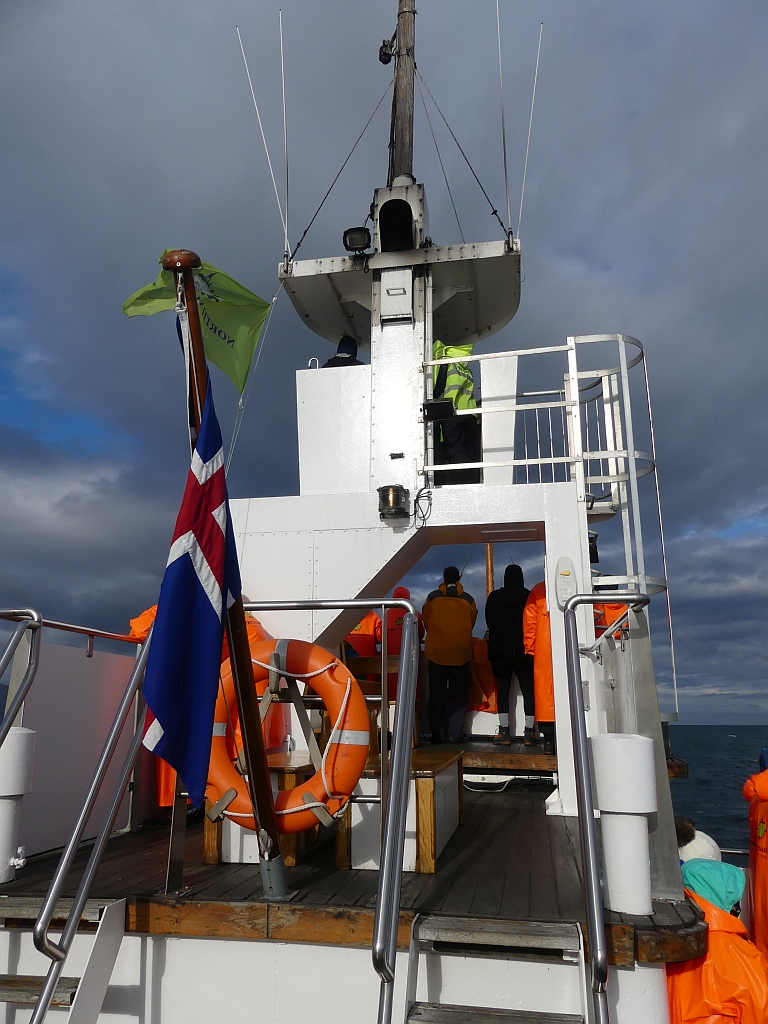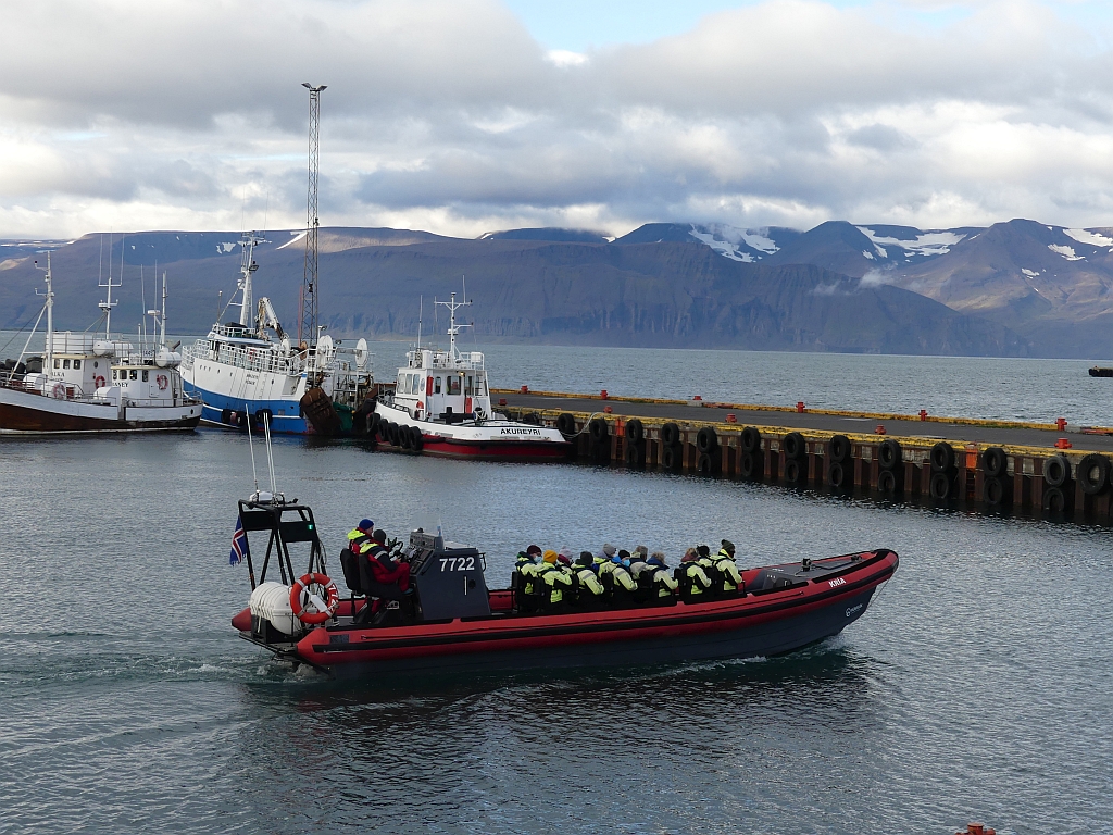 Am Ende fanden wir zwei strategisch hervorragende Stehplätze am Heck des Schiffes: Meike stand Steuerbord und Jens Backbord. So standen wir und standen wir und legten lange noch nicht ab. Vorher musste nämlich anscheinend noch dieses Schnellbootes an uns vorbei aus dem Hafen in den Skjalfandi Bucht drängeln.