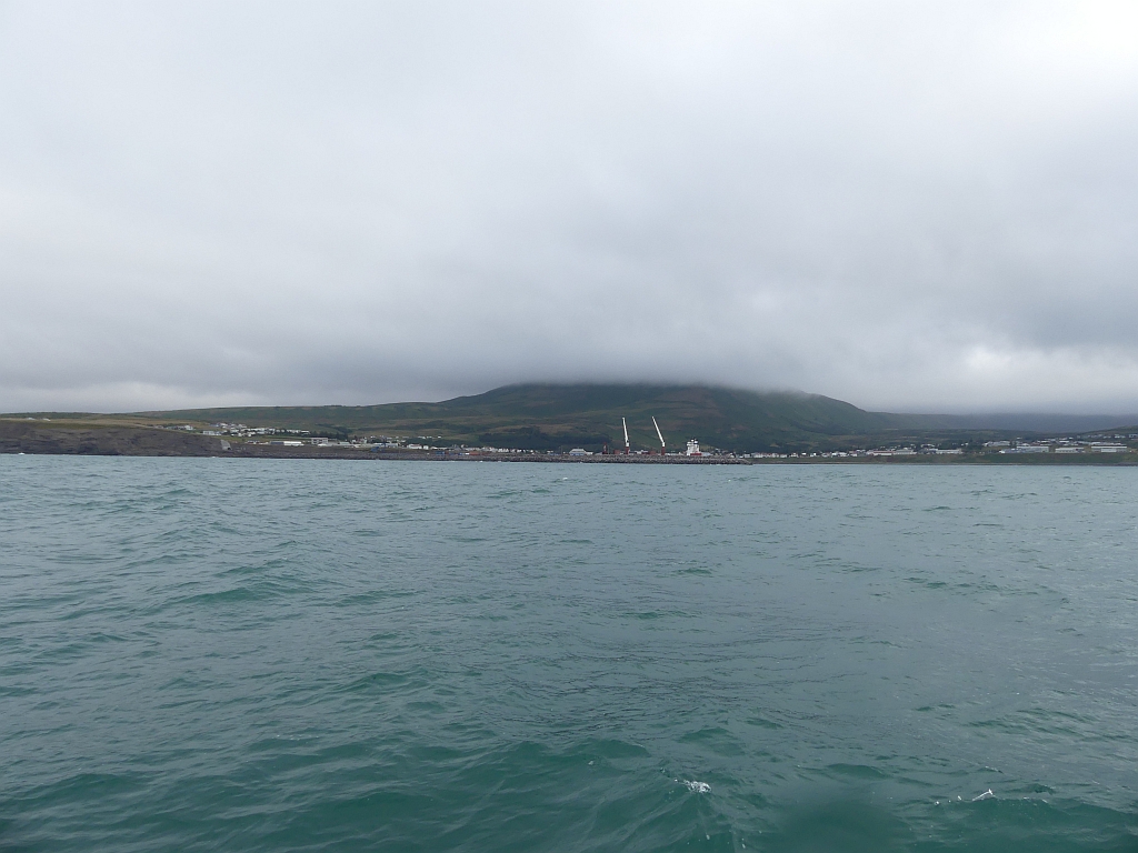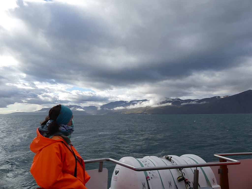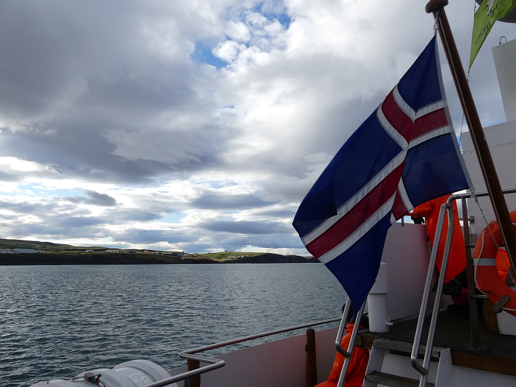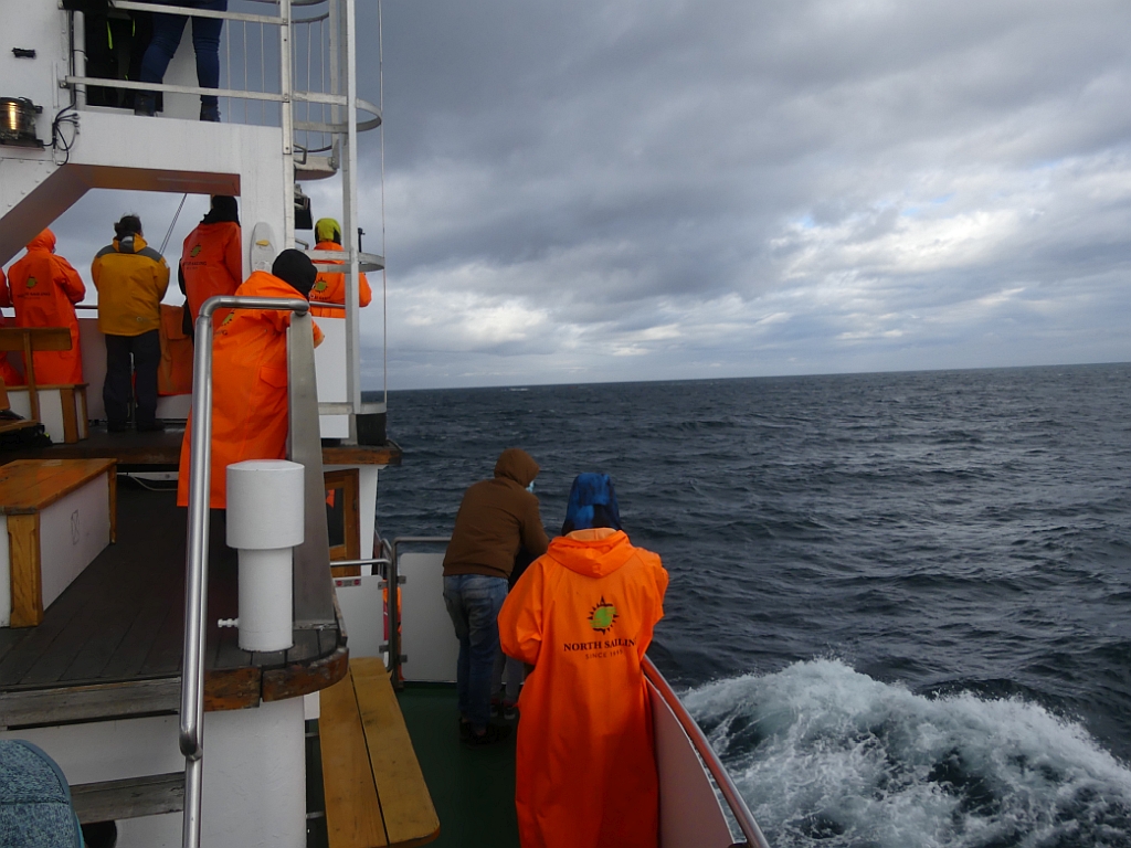 Danach ging es aber los. Der Wind war durchaus spürbar aber nicht unangenehm. Und unsere Plätze garantierte uns Fotos zu beiden Seiten des Schiffes sogar nach vorne hin an den Aufbauten vorbei. Und natürlich zurück auf den Hafen von Husavik.