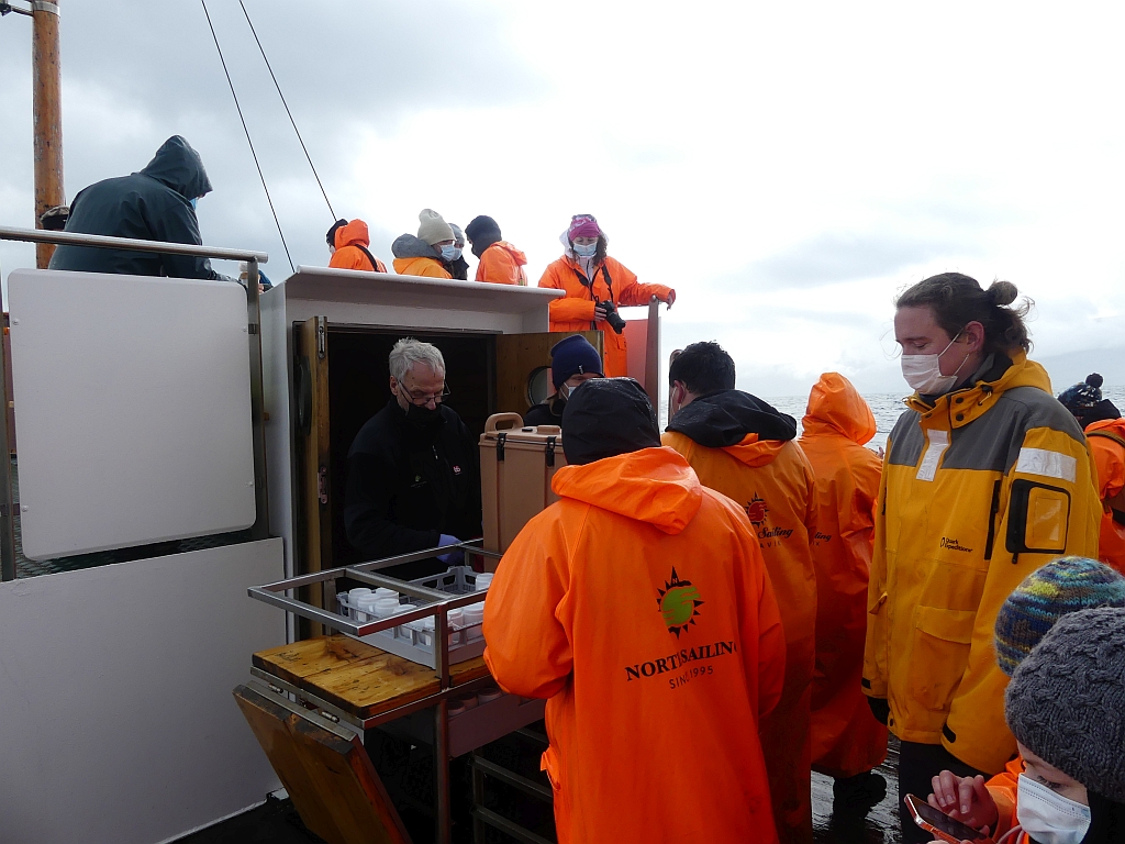 Während wir uns in die von den Walen bevorzugten Gewässer schipperten, wurden wir angenehm von der Crew informiert. Über die Region, das Schiff, die Tierwelt und alles andere.