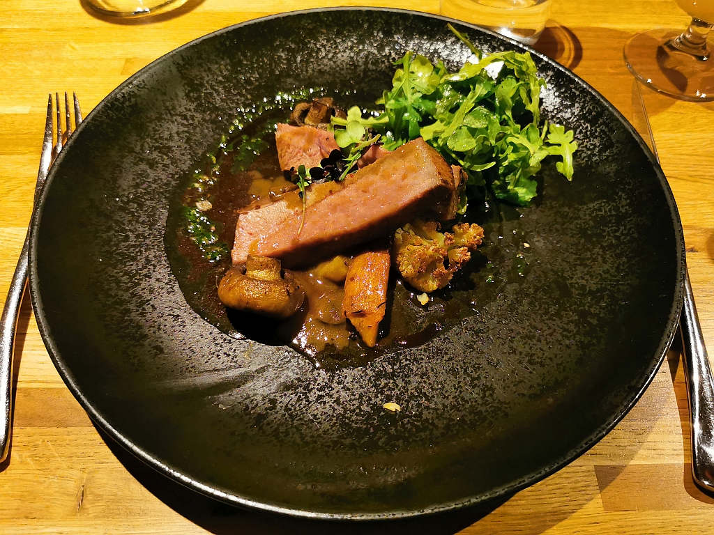 Und als Abschluss ein vorzügliches Stück Lamm. Bis auf die Pilze, die alle zu Meike gegangen sind. Spannend war hier der angebratene Blumenkohl und das super intensive Pesto, was zusätzlich zur Soße einen Extra-Kick gab.