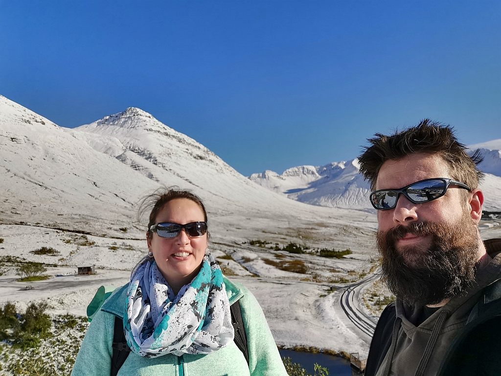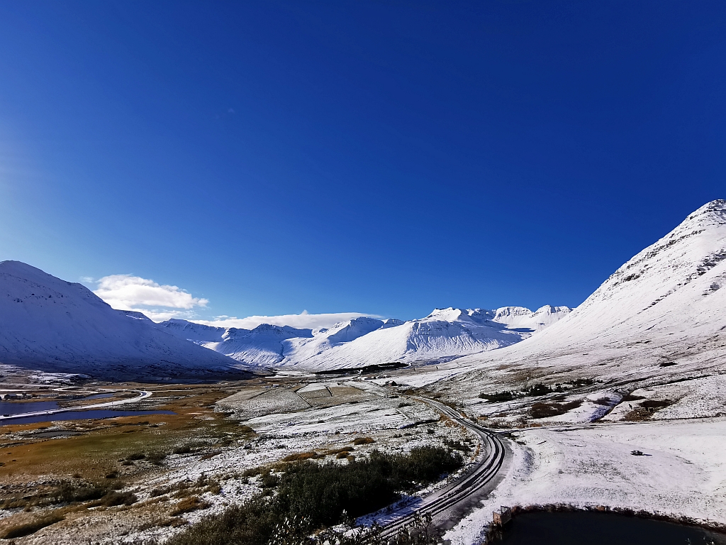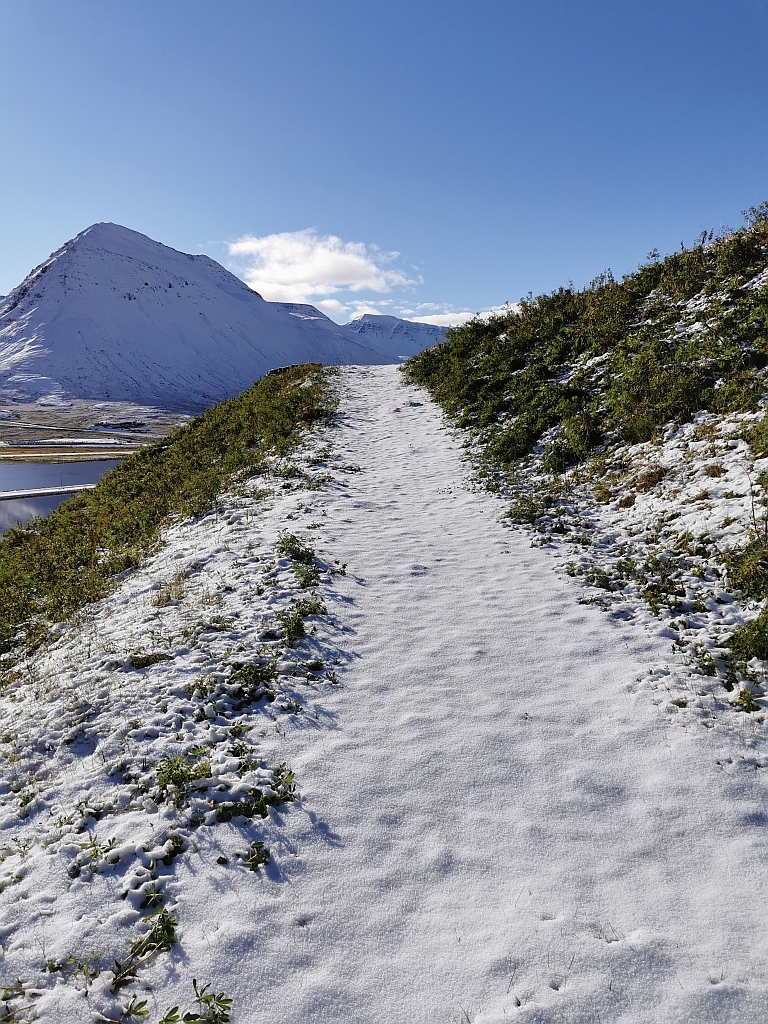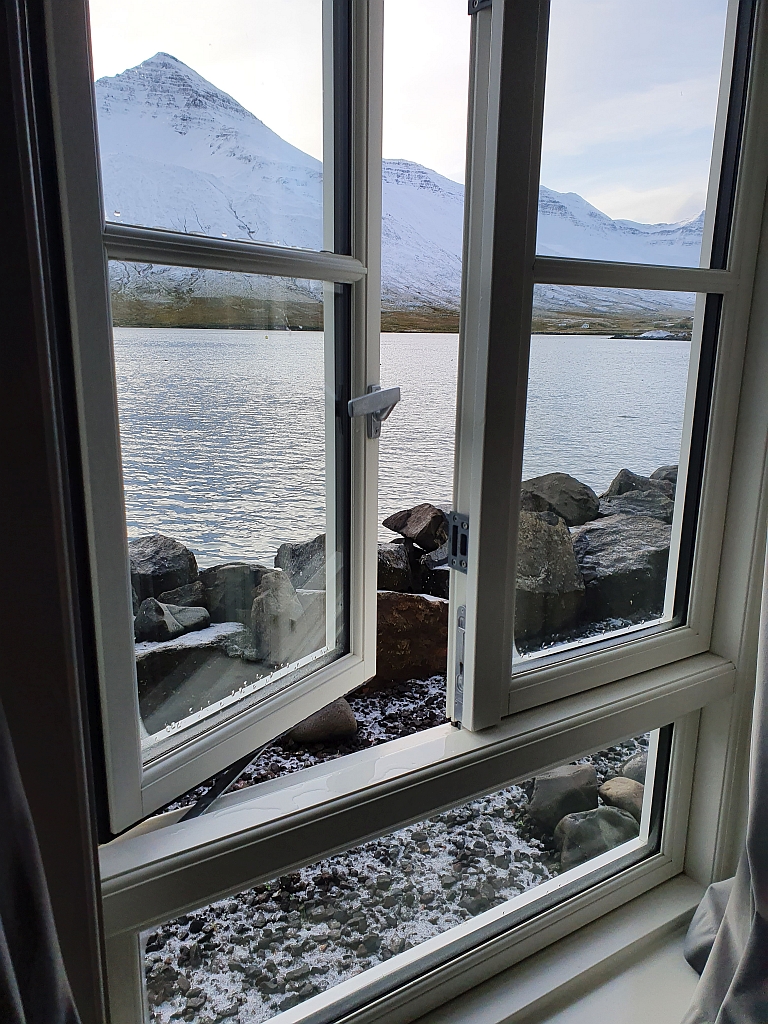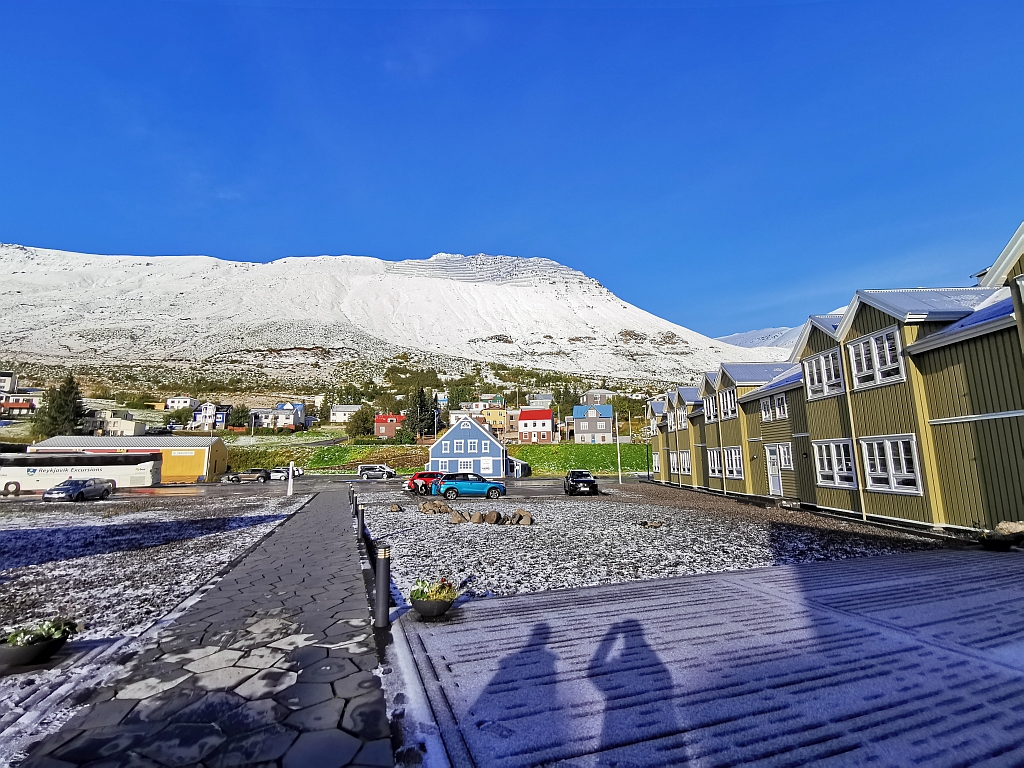 Ja, Island wurde über die Nacht mit Puderzucker bestreut. Und dankenswerterweise waren die Wettergötter auch so freundlich, den Himmel gleich hellblau zu gestalten. Bei solchen Aussichten begannen wir uns doch etwas schneller als normal anzuziehen und das (für Island recht umfangreiche) Frühstück einzunehmen.