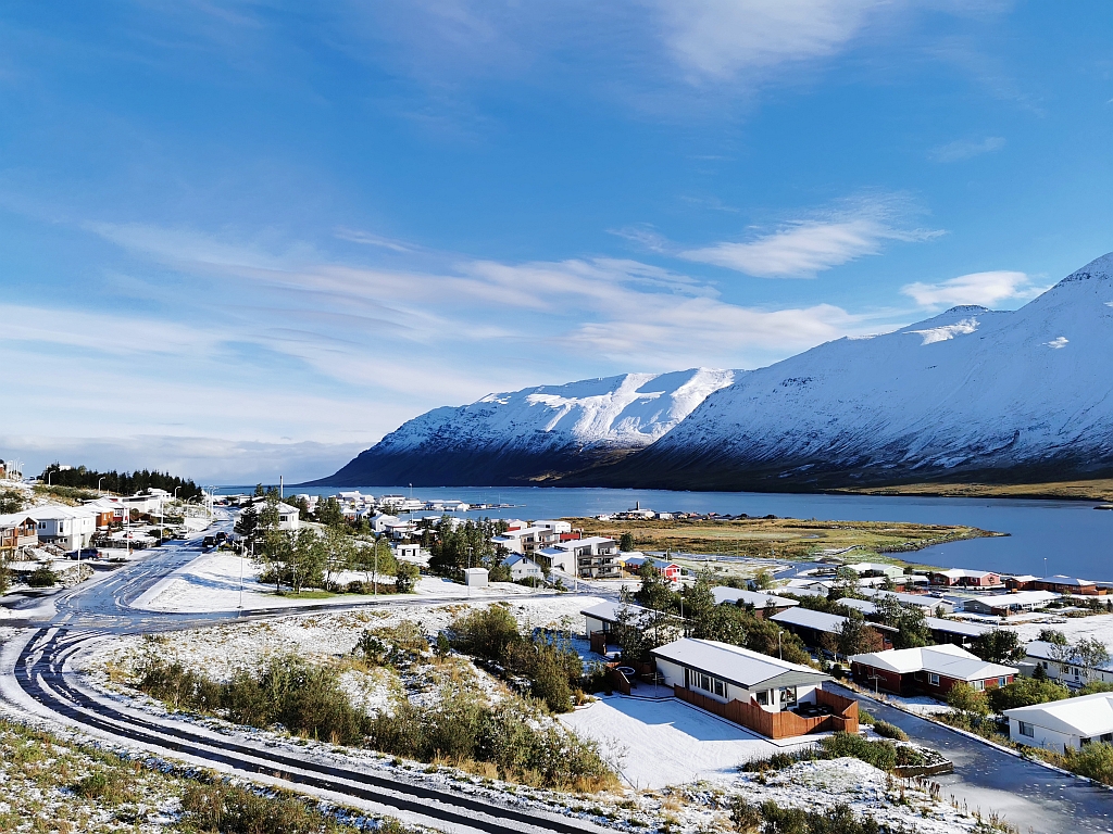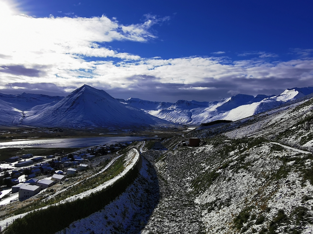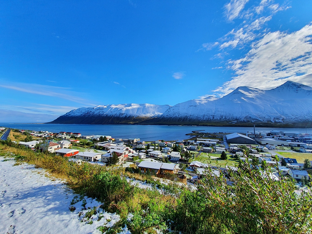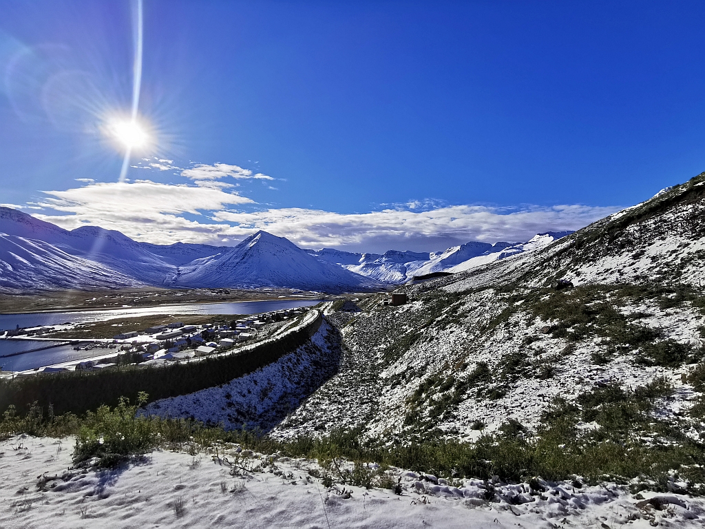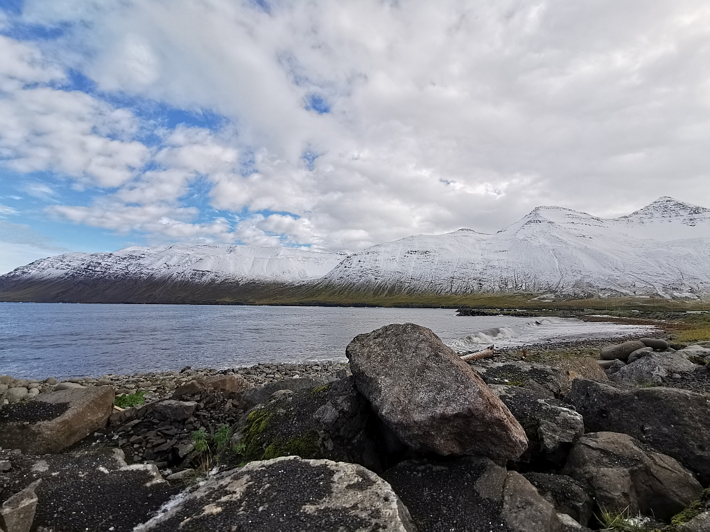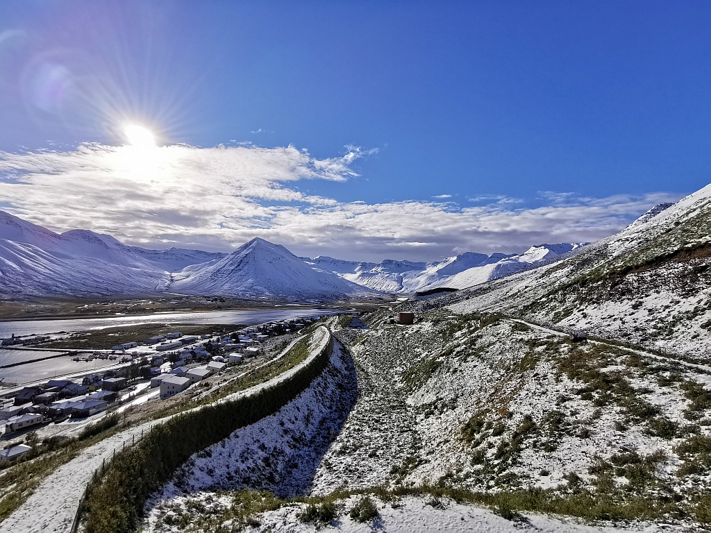 Ja, Island wurde über die Nacht mit Puderzucker bestreut. Und dankenswerterweise waren die Wettergötter auch so freundlich, den Himmel gleich hellblau zu gestalten. Bei solchen Aussichten begannen wir uns doch etwas schneller als normal anzuziehen und das (für Island recht umfangreiche) Frühstück einzunehmen.