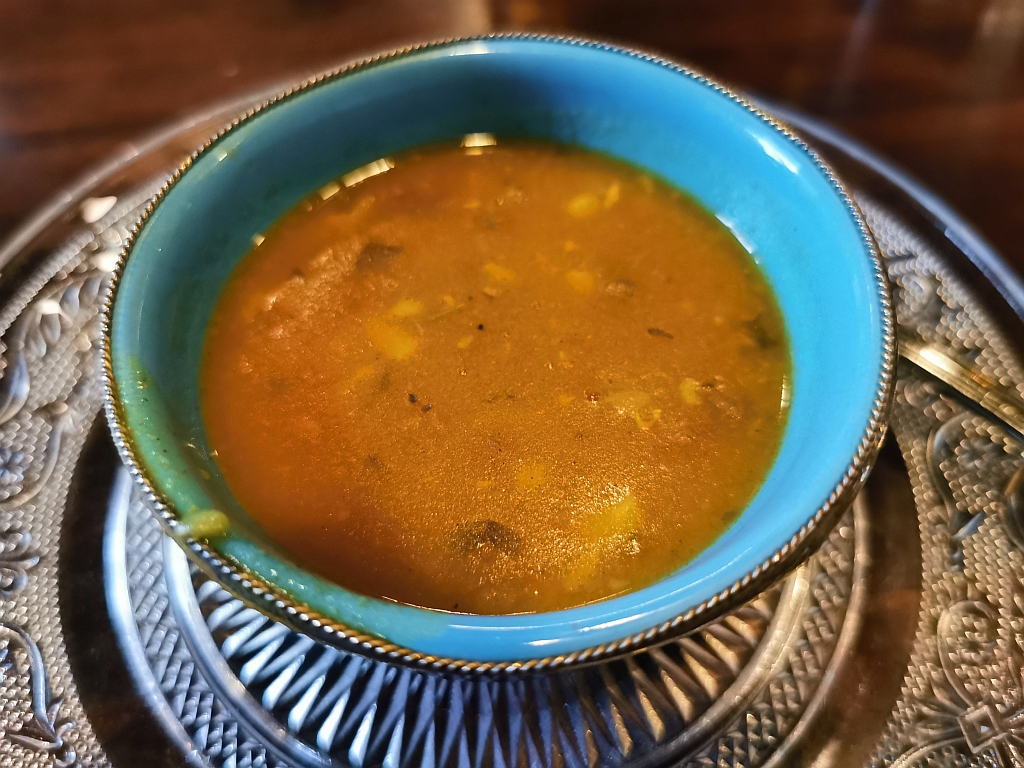 Nein, es liegt am Essen. Als „Gruß aus der Küche“ gab es nämlich eine Harira, eine klassische Tomatensuppe mit Kichererbsen und Linsen.
