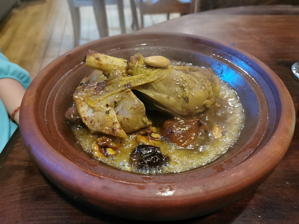 Meike hatte sich für eine Lamm Taijine mit Pflaumen, Feigen und Datteln entschieden. Butterzart, gutes Lamm (wo, wenn nicht hier), aber etwas fettig. Und sehr viel.