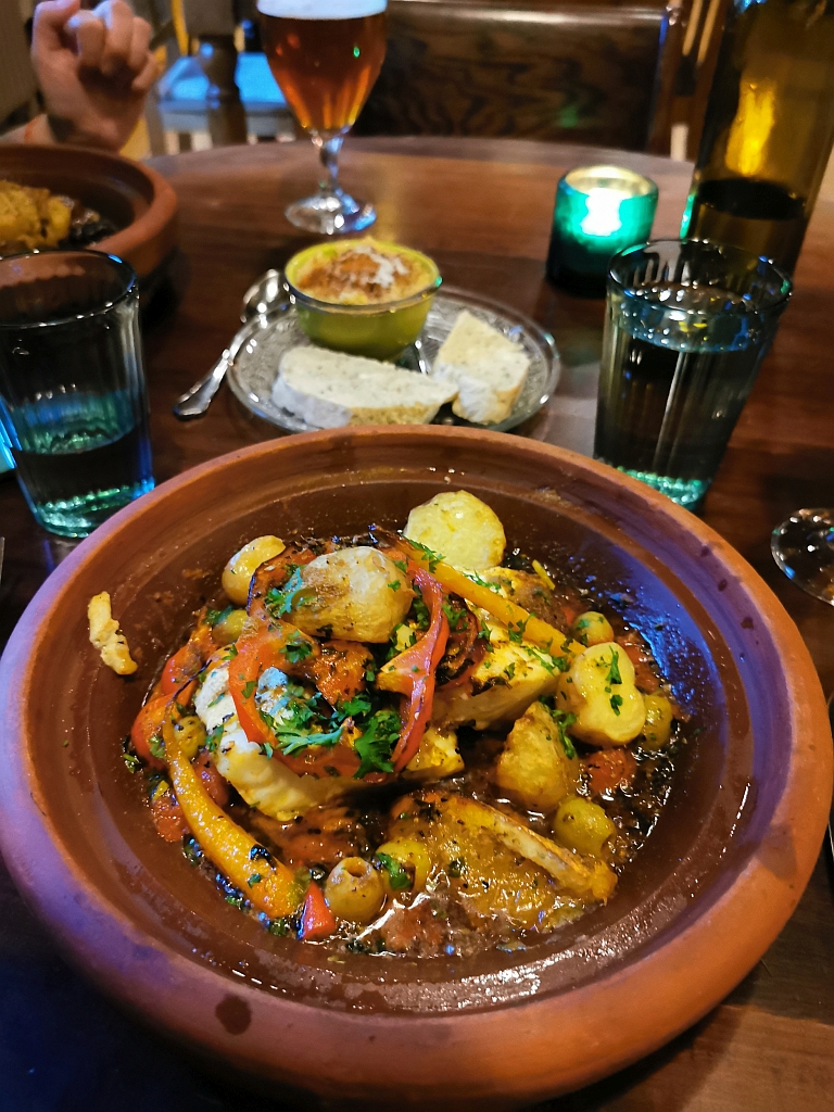 Und Jens hatten den Jackpot getroffen: Eine Fisch Taijine mit Limetten, Oliven, Fenchel und marokkanischen Gewürzen.