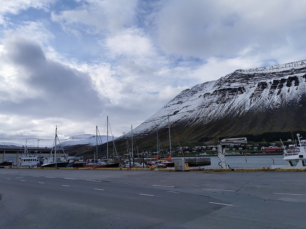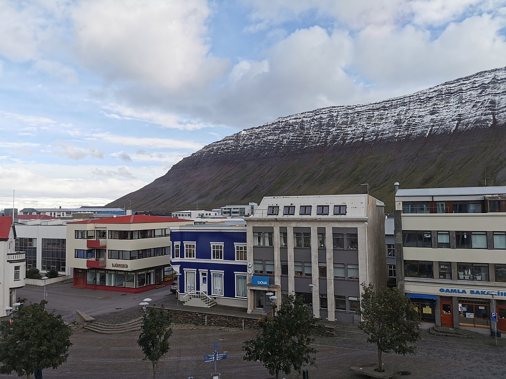 Von unserem Hotelzimmer hatten wir einen Blick auf die recht leere Fußgängerzone des 2.700 Einwohner zählenden Ortes am Skutulsfjörður, einem Seitenarm des großen Ísafjarðardjúp. Die Stadt wird erstmals im Landnahmebuch um 920 erwähnt, als hier Helgi Magri Hrólfsson einen Hof errichtete. Seitdem ist der Ort stetig gewachsen und hatte im 18. Jahrhundert eine wichtige Bedeutung als Zentrum der Klippfischverarbeitung.