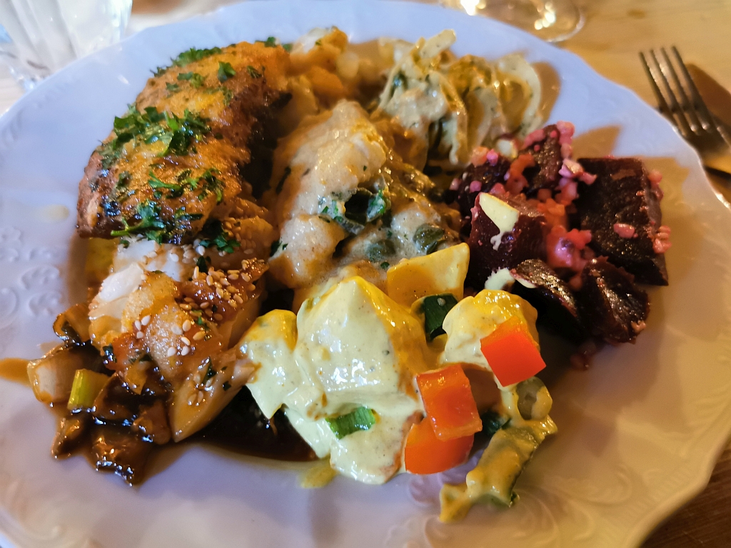 Man wird, eher ungewöhnlich für Island, an langen Tischen zusammengesetzt (wir leider mit einem recht stillen Pärchen aus Montreal) und wird dann tischweise zu den bereitstehenden Speisen gebeten. Spannend, fand auch Meike!