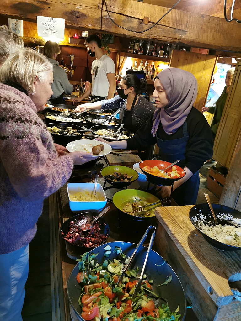 Das Essen war einfach und natürlich auf Mengen gekocht. Die Damen und Herren hinter der Theke schienen uns aber dem Verhungern nahe einzuschätzen und luden auf die Teller, bis nix mehr ging.