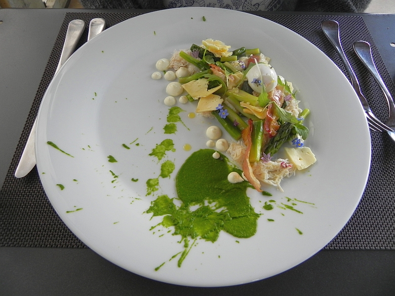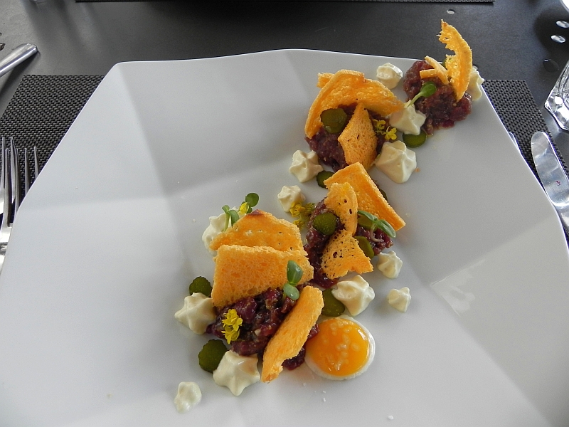 Vorspeise: Elch-Tartar mit Brioche /Spargel mit Käse, Krebs und Schinken