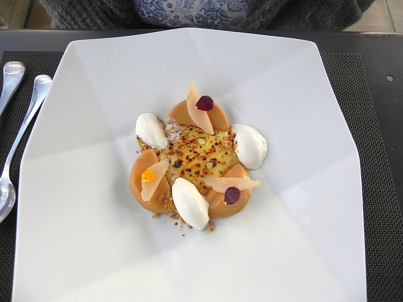 Am Ende gab es noch einen Gruß aus der Küche: Orangengelee und weiße Schokolade mit Pistazien und Pflaumen.
