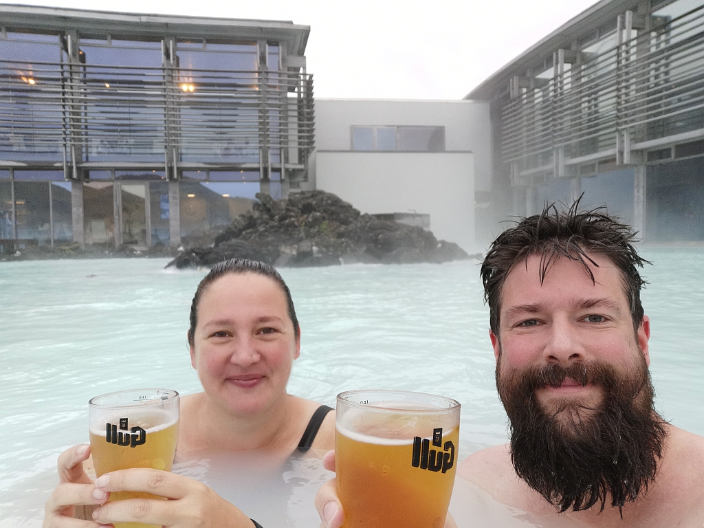 Am Eingang gab es für uns als Hotelgäste einen eigenen Eingang und mit dabei waren Handtuch, Bademantel und 1 Bier pro Person. Für uns war die Prozedur ja nix neues mehr, denn auch hier läuft das wie in jedem anderen isländischen Bad: Ausziehen, nackig duschen gehen, Badehose anziehen und ab ins Wasser.
