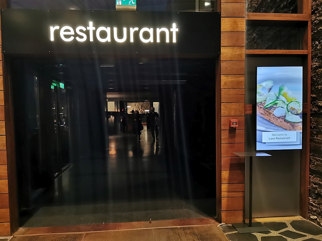 Ab ins Restaurant. Die blaue Lagune hat zwei Restaurants: Das Lava Restaurant und das Moss Restaurant. Letzteres wurde unlängst mit einem Michelin-Stern ausgezeichnet, hatte aber während unserer Zeit in Reykjavik entweder keinen Tisch mehr frei oder gar nicht auf. Also ging es für uns in das Lava Restaurant, ein direkt am Ein-/Ausgang des Bades gelegenes Restaurant, was auch vom Bad aus einen separaten Zugang hat.