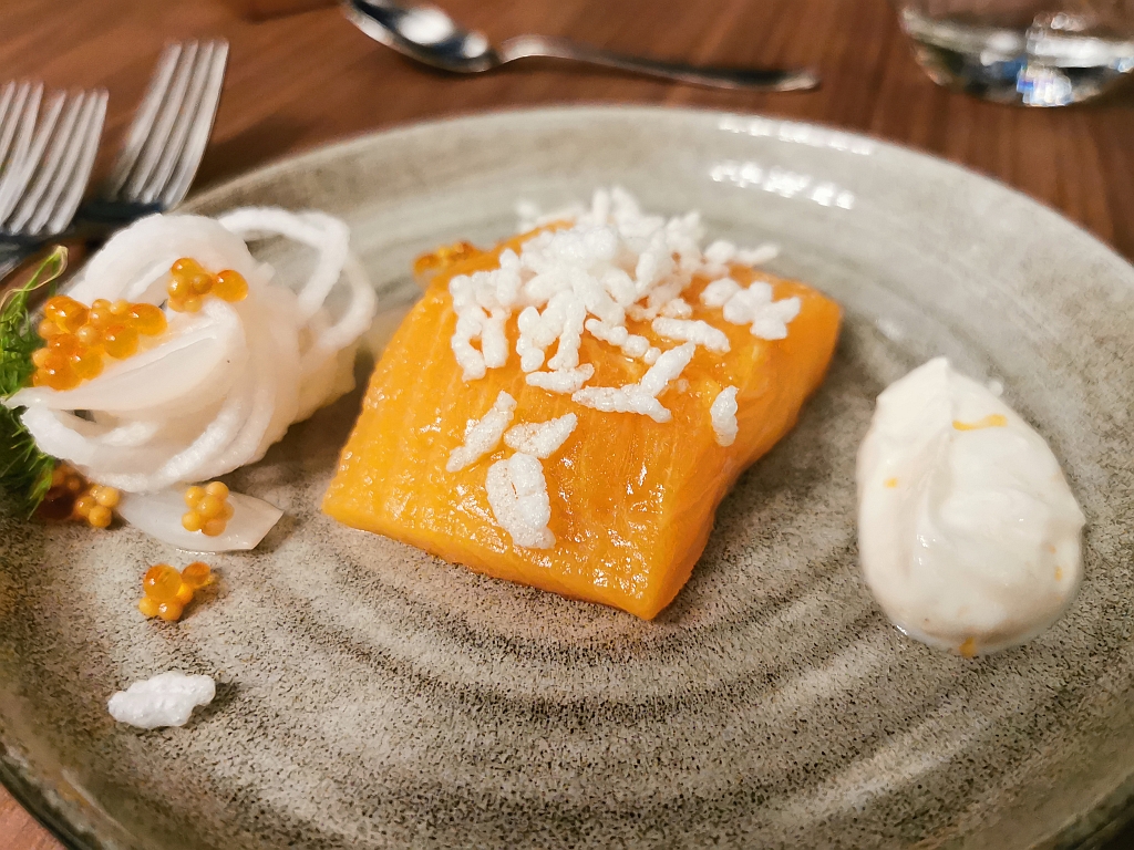 Das 4 Gang Menu bestand aus einem guten Seesaibling mit Puffreis, Sellerie-Spaghetti und Fischrogen. Rechts noch Schmand mit Zestenabrieb.