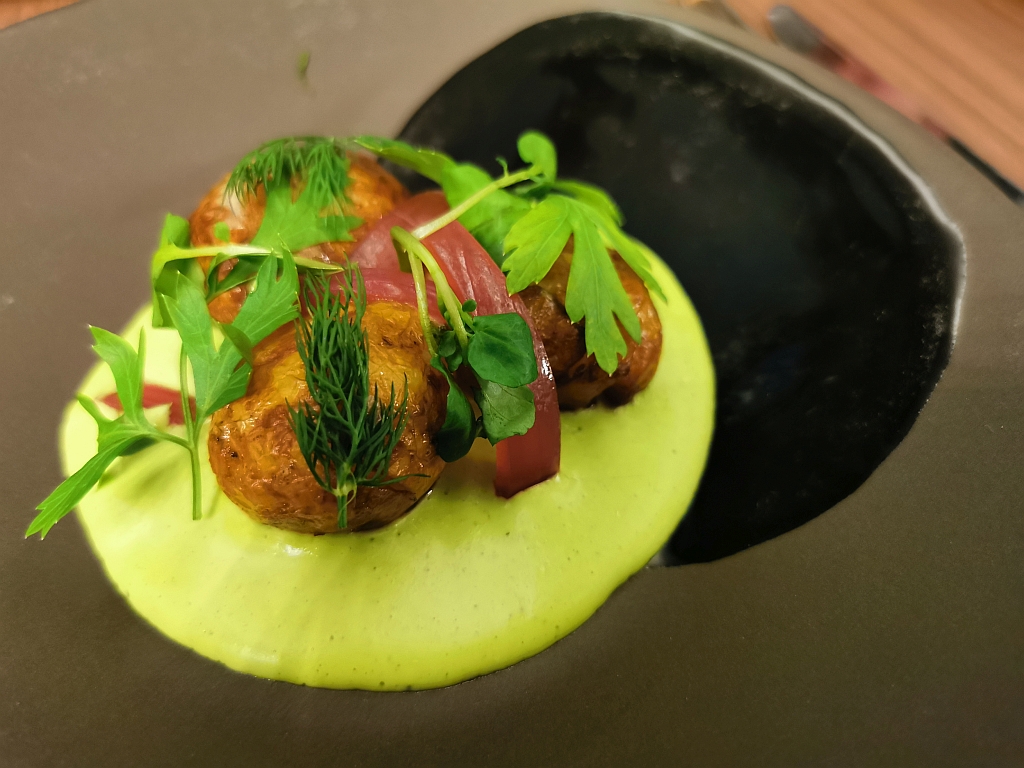 2. Gang war vegetarisch: 3 Kartöffelchen mit Kräuter-Soße und eingelegten Zwiebeln.