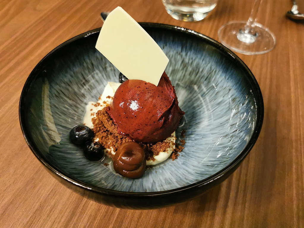 Nachtisch geht ja bekanntlich immer, also her mit dem Blaubeer-Eis, Vanillecreme, weißer Schokolade und Crunch.