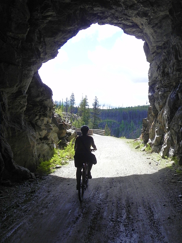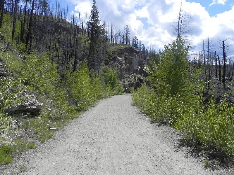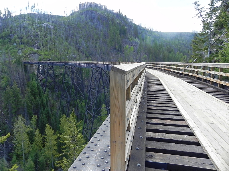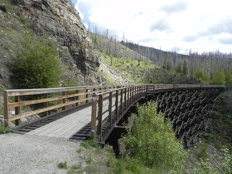 Der Rail Trail liegt teilweise im Myra Canyon und ist seit dem Abbau der Bahntrasse in 1989 zum Wander- und Radweg umgebaut worden. In 2003 wurden große Teile der Strecke Opfer eines Waldbrandes, der unter anderem 12 der 18 Brücken („Trestles“ genannt) zerstörte. Diese wurden durch viel Eigeninitiative der Bürger von Kelowna und dem Bundesstaat British Columbia wieder aufgebaut und stehen seit 2006 wieder zur Verfügung. Leider waren heute einige Teile der Strecke (ab Trestle #3) gesperrt, sodass unsere Strecke lediglich 14 Kilometer betrug. Bei den 27 °C wollten wir jetzt aber auch keine Tour de France-Etappe starten, also sind wir gemütlich die Strecke geradelt.