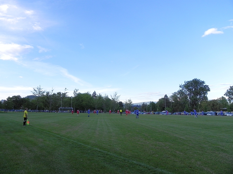Zu sehen ist das Spiel der KMSL Division 1 zwischen S.O.B. FC und Modern Furniture Pikeys. Die Liga ist eine lokale Freizeit-Liga, in der in 3 Ligen 40 Mannschaften Kelownas spielen – nicht schlecht für eine Stadt von etwa 120.000 Einwohnern mit einer semi-Pro Eishockey Mannschaft. Wir haben uns dann noch ein wenig mit den Auswechselspielern von S.O.B. unterhalten, meistens Engländern, die uns zuerst schon anwerben wollten („Hey, man kann sich auf der Homepage auch anmelden, wenn man spielen möchte und sich ein Team aussuchen!“) … bei der großen Anzahl von Rumpelfüsslern hätten wir sogar Chancen … und dann erstmal herausfinden mussten, gegen wen sie eigentlich spielen (Frage an den Trainer von einem Spieler „Hey mate, who are the others anyway?“). Während der Unterhaltung hat S.O.B., aktuell im hinteren Teil der Tabelle, sogar ein Tor geschossen. Wie, das wusste niemand. Kam wohl auch eher überraschend, denn der Gegner ist 3. in der Tabelle. Wir verabschiedeten uns auf dem Höhepunkt des Spiels und sind wieder ins Hotel gefahren.