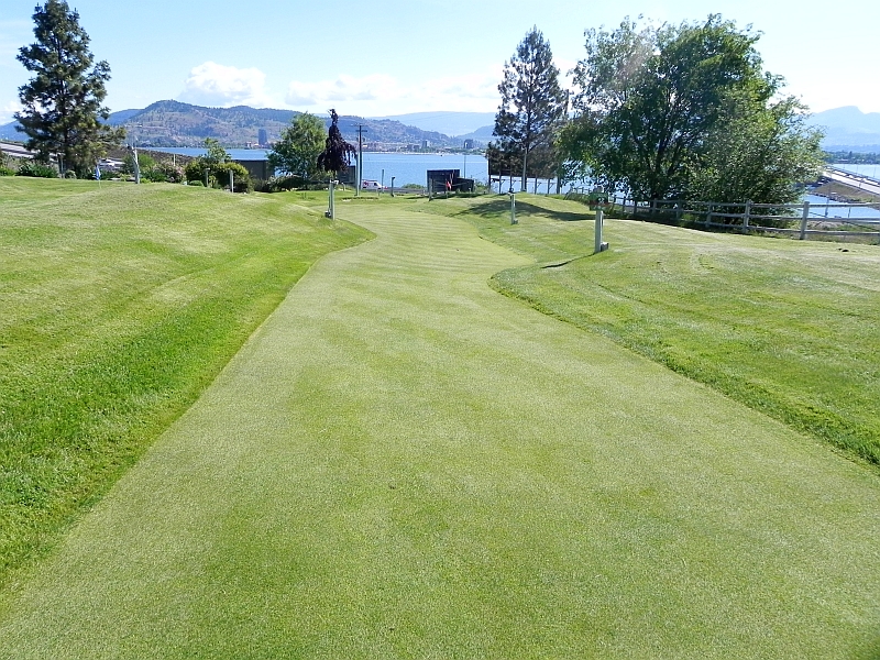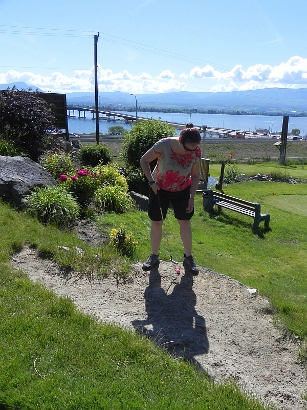 Letztendlich ist der reisende Teufel natürlich und verdientermaßen der neue Putt-Golf-Champion von Kelowna mit 68:86 (wobei die ersten 9 Löcher ausgeglichen waren). Nach einer ausgiebigen Ehrenrunde bei den Zuschauern (4 Vögel, diverse Schmetterlinge, ein Erdhörnchen und ein verblüffte Angestellte, der mit dem Rasenmäher zwischen den Bahnen unterwegs war und wirklich nix mit meinem Jubel anfangen konnte) ging es dann weiter.