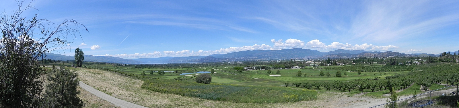 Nach einem kurzen Stopp bei der Tourist Info haben wir uns entschlossen, zum Kettle Valley Rail Trail zu fahren, einer ehemaligen Eisenbahnstrecke, die nun zum kombinierten Wander- und Radweg umgebaut wurde. Dort kann man sich Fahrräder mieten und dann mit diesen die Strecke entlangfahren. Auf dem Weg kamen wir an einem Ausblick über Kelowna vorbei – wir mögen die Stadt sehr! Auf dem Panoramabild kann man unter anderem erkennen warum.
