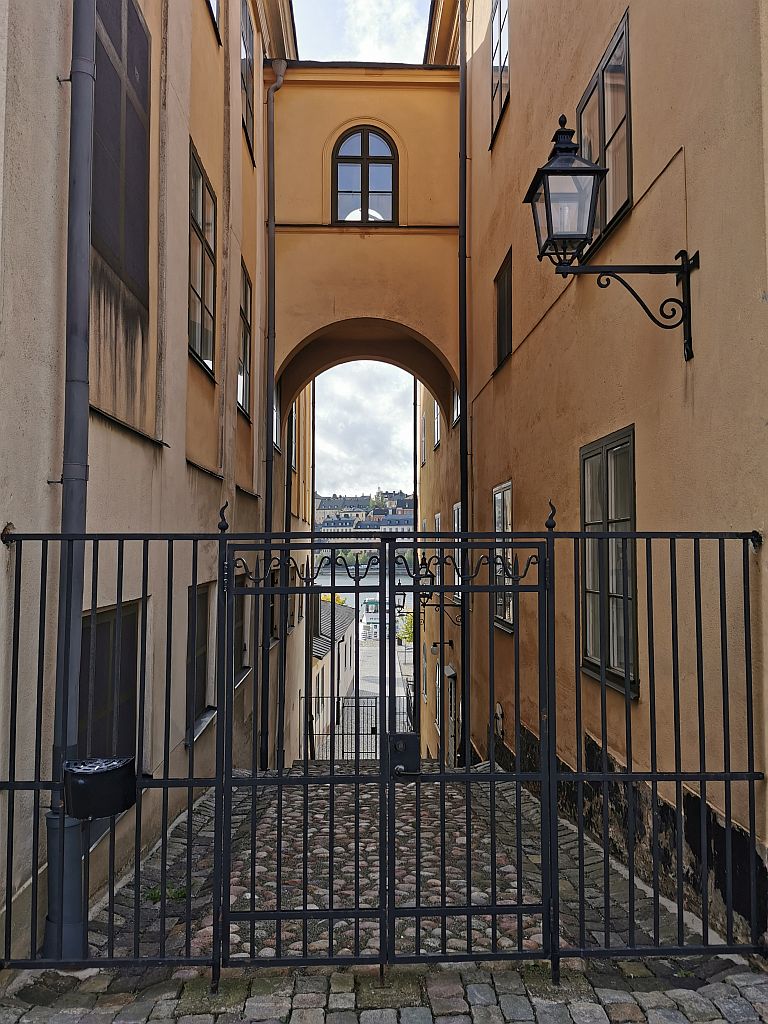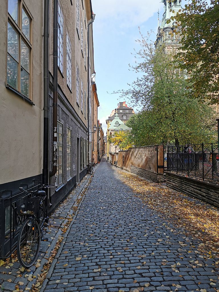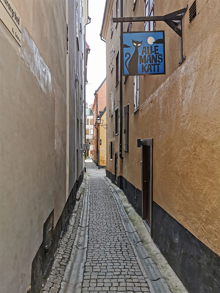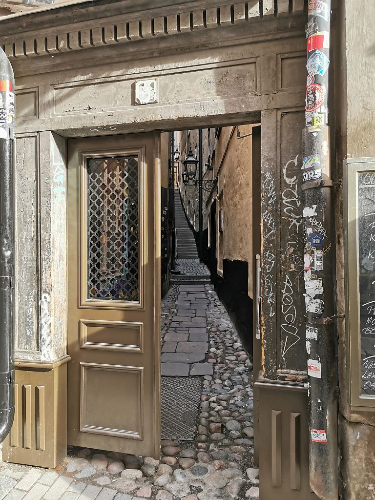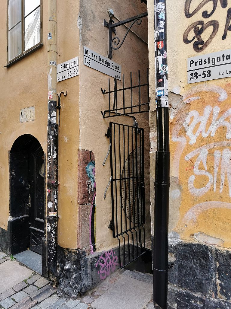 Die Rundtour, der wir folgten, hatte übrigens zu jedem Halt einige Informationen und war sehr angenehm zu folgen. Und neben den Hauptattraktionen fanden sich auch ein paar skurrile Dinge auf dem Programm, so zum Beispiel „Mårten Trotzigs gränd„: Die an der engsten Stelle nur 90 Zentimeter messende, schmalste Straße in Stockholm.