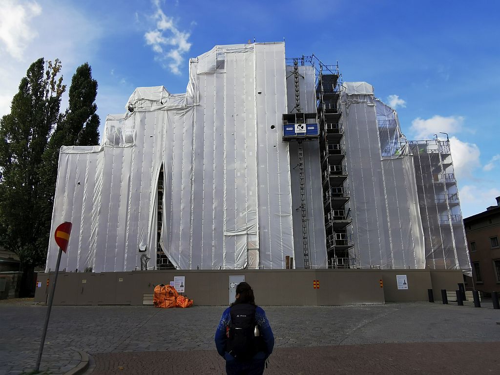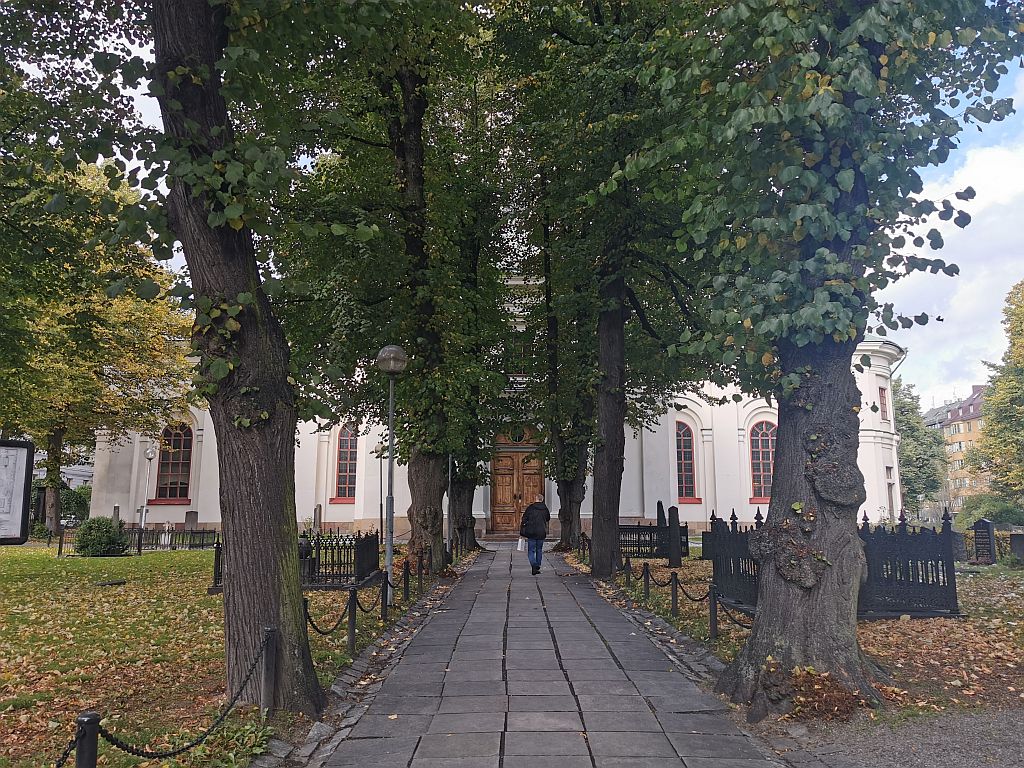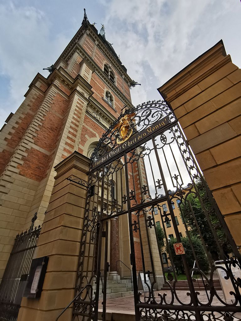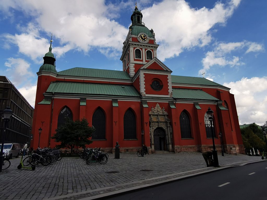 Oh, die „Tyska kyrkan“, die deutsche Kirche Stockholms. An dieser Stelle stand zuerst das Gildenhaus der deutschen Kaufmannsgilde, diese wurde aber, weil sie zu viel Einfluss bekam, 1544 aufgelöst und aller Besitz gepfändet. An der Stelle wurde dann 1571 erlaubt eine Kirche zu errichten. Die heutige Kirche, auch St. Gertrud genannt, wurde 1643 eröffnet.