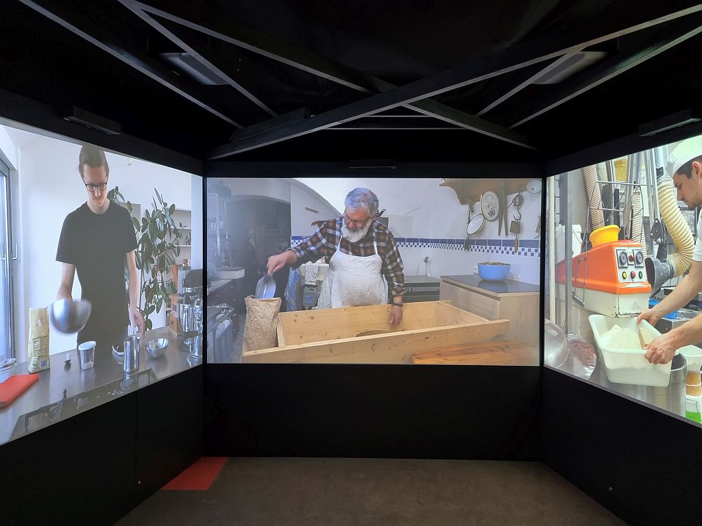 Jens war fasziniert von diesem dreigeteilten Video, in dem die Herstellung von Brot gezeigt wird. Einmal (links) von einer Privatperson, einmal (in der Mitte) von einem handwerklichen Bäcker und einmal (rechts) in einer großen Fabrik. Und das einigermaßen synchron, sodass man die jeweiligen Schritte vergleichen konnte.