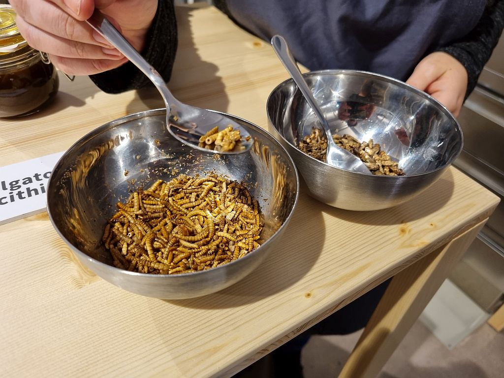 Genauer gesagt gab es zukunftsträchtige, weil nachhaltiger zu produzierende Lebensmittel wie Maden oder Heimchen. Na dann Mahlzeit. Schmeckt übrigens eher neutral und crunchy das Gewürm.