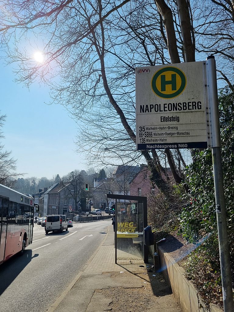 Eine echt schöne und höchst abwechslungsreiche Etappe ging zu Ende. Mit dem Wetter hatten wir sehr viel Glück, die Kopfschmerzen waren auch schon lange weg und wir waren schon ein wenig stolz den Schweinehund überwunden zu haben. Welcher sich noch einmal lautstark meldete, als wir an dieser Bushaltestelle in den Schnellbus nach Aachen einstiegen.