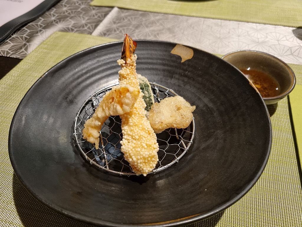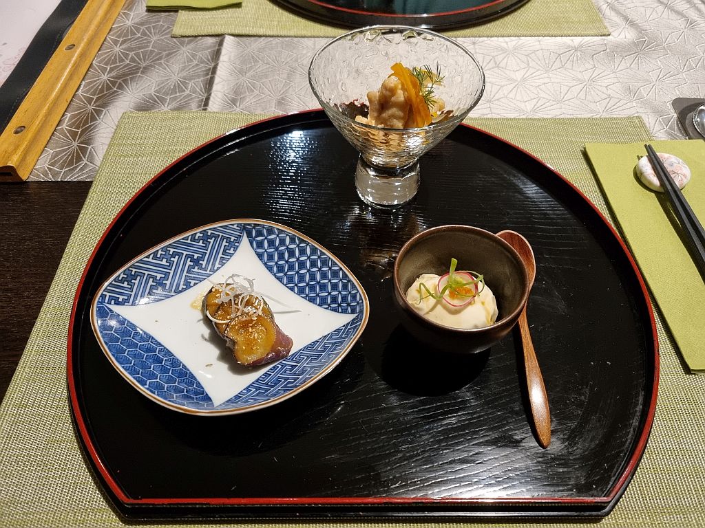 Zum Start gab es dann auch drei Kleinigkeiten, die die schon echt hohe Kunstfertigkeit der Küche zeigte: Eine Aubergine in Misolack, eine Misocreme mit Rogen und Rettich und ein sehr leicht frittiertes Stück Tempura mit leicht essig-lastigem Gemüse.