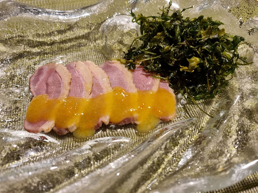 Danach: Entenbrust mit Orangen-Dressing und fritierten Kräutern.