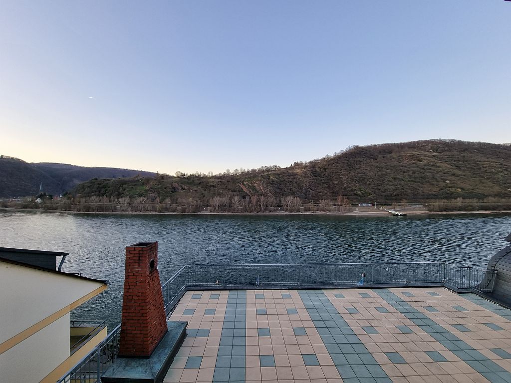 Unser Zimmer lag dieses Mal im obersten Stockwerk mit einem schönen Blick auf … eine Terrasse und den Rhein. Naja, aber immerhin war es ruhig.
