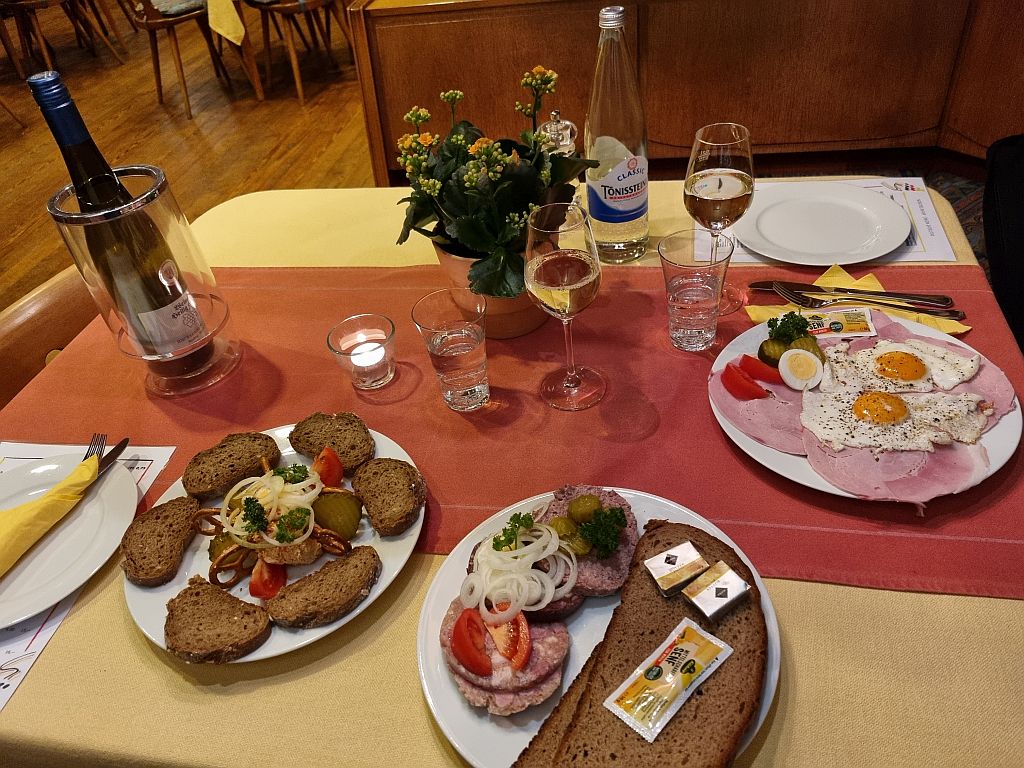 Da wir am ersten Abend ja kein Abendessen gebucht hatten, suchten wir uns eine Alternative in Boppard. Und fanden diese im Weinhaus Heilig Grab, direkt um die Ecke. Ende 2021 waren wir hier das erste Mal eingekehrt und obwohl uns die doch eher süßen Rieslinge des Mittelrheins immer noch einige Fragezeichen auf der Stirn erscheinen lassen, fühlen wir uns hier sehr wohl! Die Weine sind allesamt gut bis sehr gut, preislich absolut im Rahmen und das Essen eben wie es sich für eine Weinstube gehört: Lecker und viel!