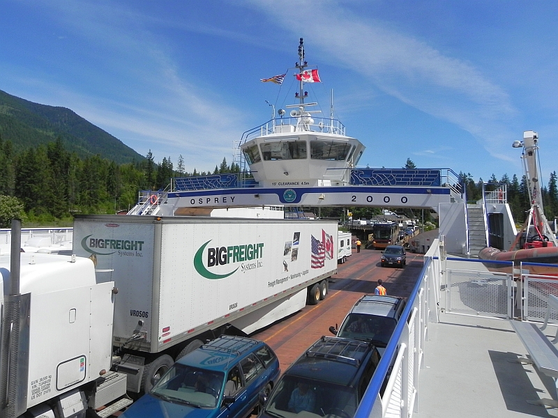 Die Fähre kam dann pünktlich und inzwischend waren auch viele weitere Autos, Motorräder und LKW angekommen, um mit der Fähre zu fahren. Das einzige, was uns noch Sorgen bereitet hat, war, dass wir nirgendwo Tickets für die Fähre kaufen konnten. Immerhin handelte es sich um eine Fährfahrt von 35 – 45 Minuten. Das löste sich aber schnell auf, denn zu unserer Überraschung handelt es sich bei der Kootenay Lake Ferry um die längste kostenlose Autofähre der Welt. Also nix wie rauf auf das Boot.