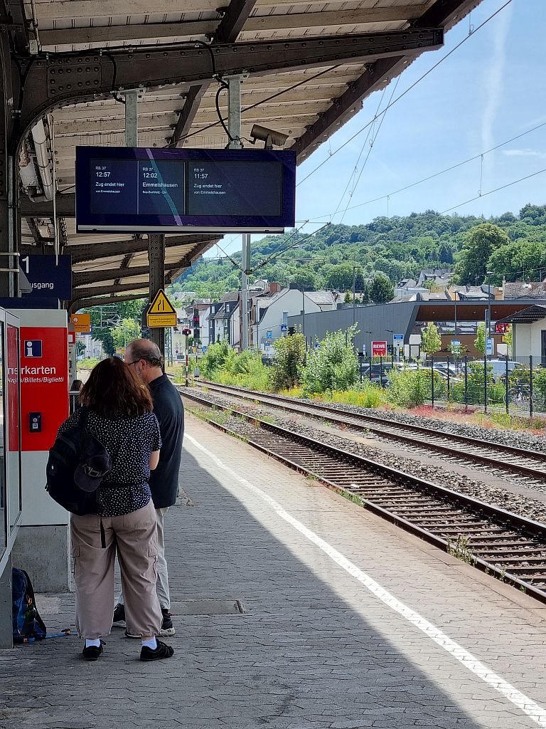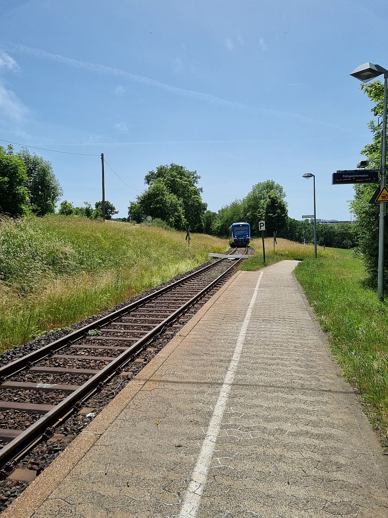 Auch wegen des sehr sommerlichen Wetters haben wir aber am Haltepunkt „Ehr“ unsere Wanderung abgebrochen und auf den Zug gewartet. Genauer gesagt sind wir die letzten Kilometer schon ziemlich zügig marschiert, weil eben der stündlich verkehrende Zug kommen sollte.