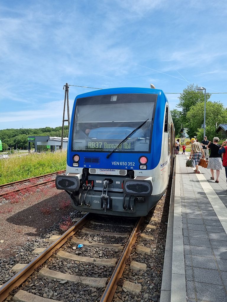 Die Strecke führte früher, wie so oft, noch weiter in den Hunsrück hinein – heute ist der kleine Ort Emmelshausen Endstation. Dazwischen ist die Strecke mit einer durchschnittlichen Steigung von 60,9 Promille die steilste Adhäsionsbahn Westdeutschlands. Also eine Strecke, die nicht mit Unterstützung eines Zahnrades überwunden wird.