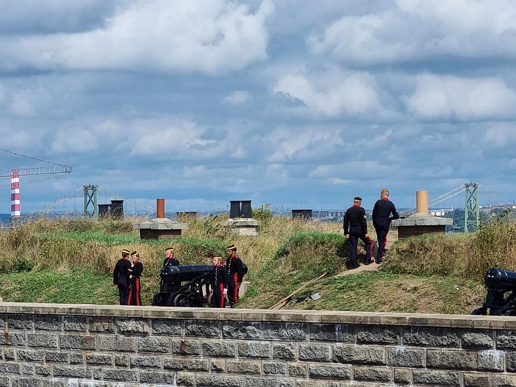 Da wir einen besseren Blick wollten, sind wir wieder etwas zurück gegangen. Viertel vor 12 kam dann eine kleine Abordnung militärisch aussehender Menschen und marschierte auf die Kanone zu. Ein Offizier brüllte ein paar Anweisungen und die Kanone wurde vorbereitet.