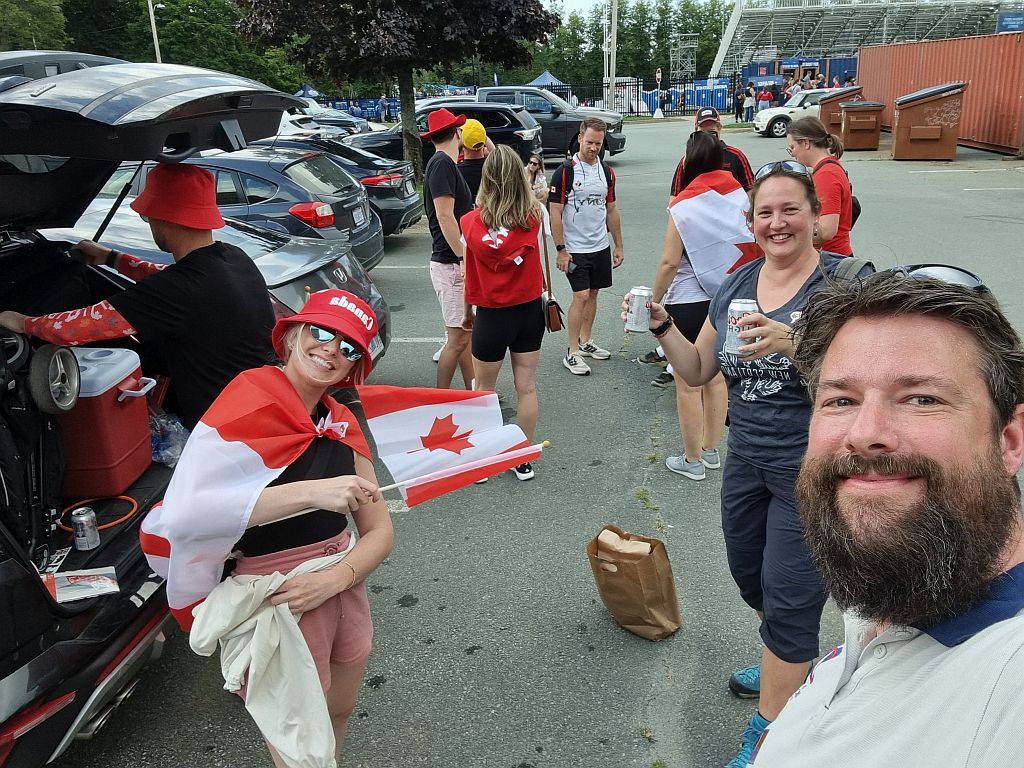 Mit den Worten „You are Canadians now!“ wurden wir zum „Tailgating“ der jüngeren Teile der Familie eingeladen, mit Fanutensilien ausgestattet, bekamen noch ein Bier in die Hand gedrückt sowie ein nicht näher erklärtes Getränk aus einem Beutel (?) kredenzt und mussten versprechen, dass wir mindestens die Tochter / Schwester anfeuern. Am Besten aber gleich das ganze kanadische Team, wenn es uns nichts ausmachen würde.