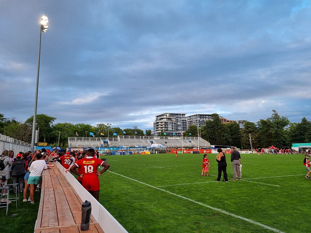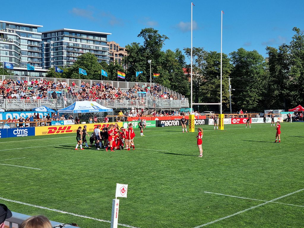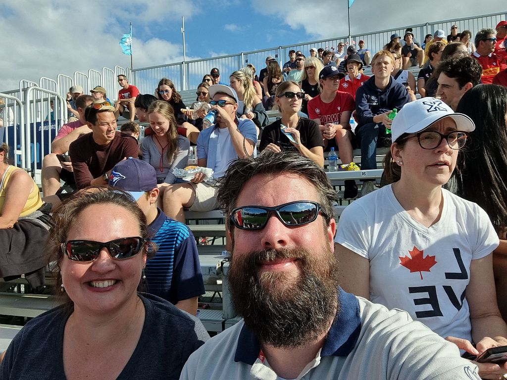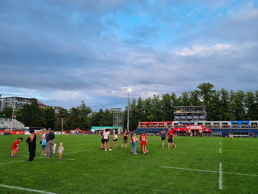 Es stellte sich heraus, dass dies die Familie Miller aus Montreal plus Freunden ist, deren Tochter Brianna in der Nationalmannschaft spielt. Mit den Eltern haben wir uns zuerst unterhalten und wurden so nach und nach assimiliert. Meike wurde als Gag als „entfernte Verwandte“ vorgestellt, was die immer weiter hinzukommenden Freunde der Familie teils sehr irritierte. Biere wurden gegenseitig ausgegeben, es wurde sich über Rugby, Sport, Politik, Wetter, Reisen, Schulsysteme (Miller Senior war Direktor einer High School) und noch vieles andere unterhalten und … nunja, irgendwann standen wir dann hier.