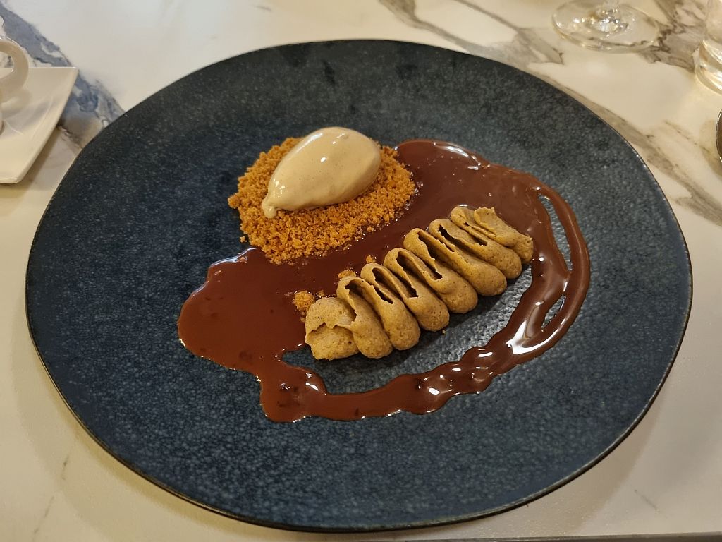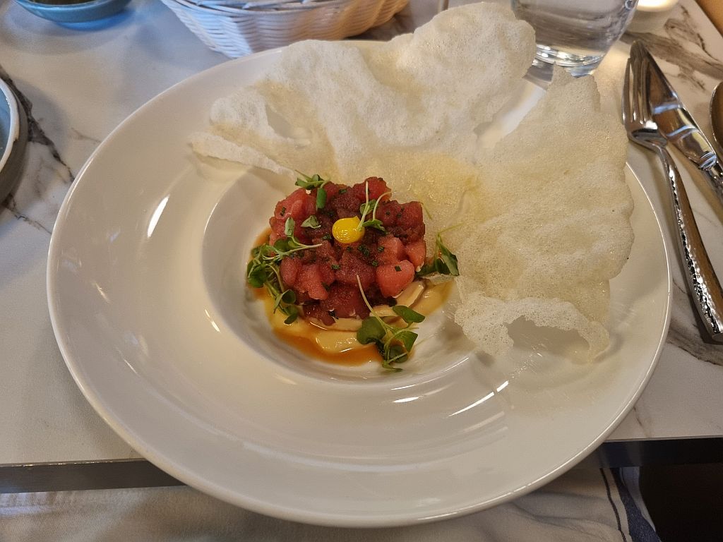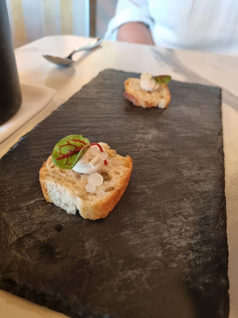 Der Gruß aus der Küche ähnelte dagegen einem Brotchip mit was Creme drauf. Das was jetzt eher was für einen hohlen Zahn denn ein kreativer Einstieg in ein Gourmet-Menu. Als Gourmet-Restaurant bezeichnet sich das Atelier Tony nämlich.