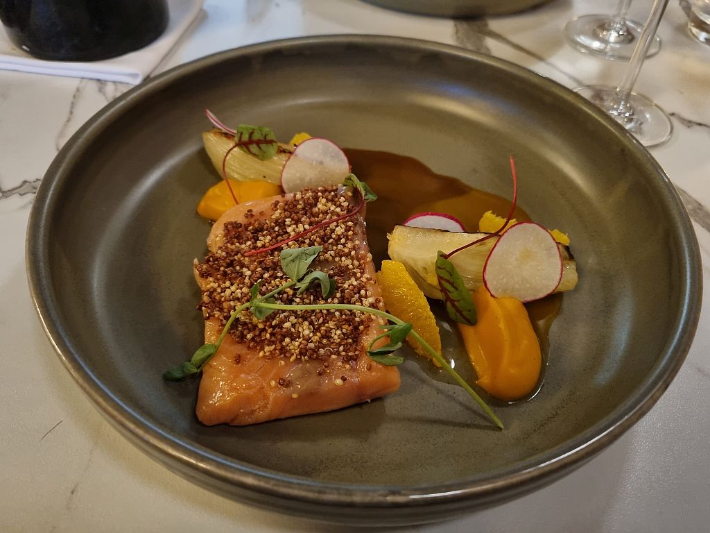 Apropos Seafood: Bei Jens gab es zum Hauptgang einen Sous Vide gegarten Lachs. Etwas, wo der Keller sehr erpicht drauf war, dass das vorab klar war. Wir haben ihm dann erklärt, dass wir selber zu Hause Sous Vide Gerichte kochen und durchaus wissen, dass der Lachs dann nicht angebraten werden muss und somit etwas anders als gewohnt aussieht.