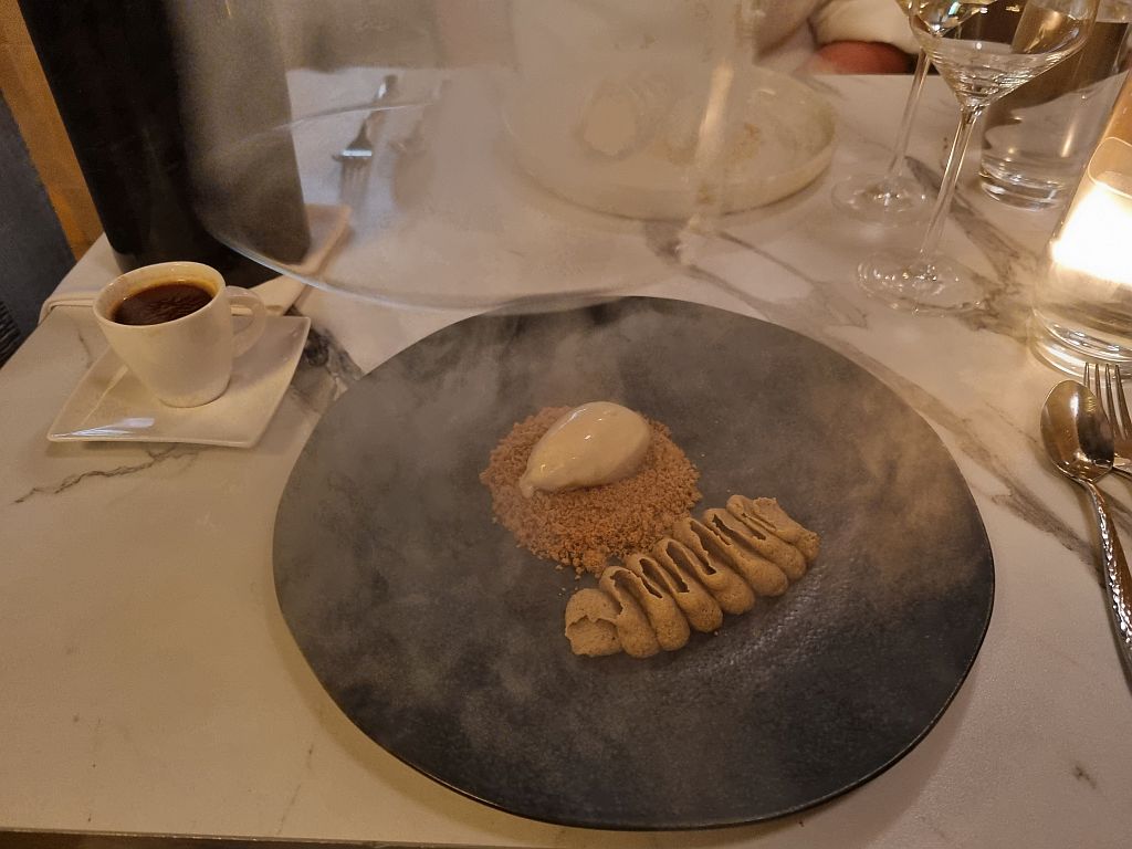 Der Nachtisch, zu dem wir uns überzeugen ließen, war dann die Kirsche auf der Sahne. Geräucherter Marschmallow mit Schokolade. Stilecht unter einer Rauchglosse serviert.