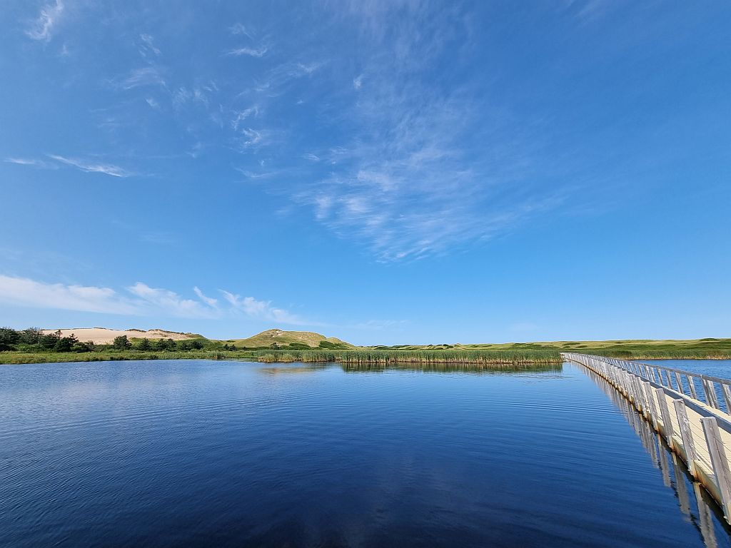 Der Trail führt hier über eine Ponton-Brücke. Und das war schon cool, erst Recht mit dem blauen Himmel, dem blauen Wasser, den grünen Pflanzen und der Düne im Hintergrund.